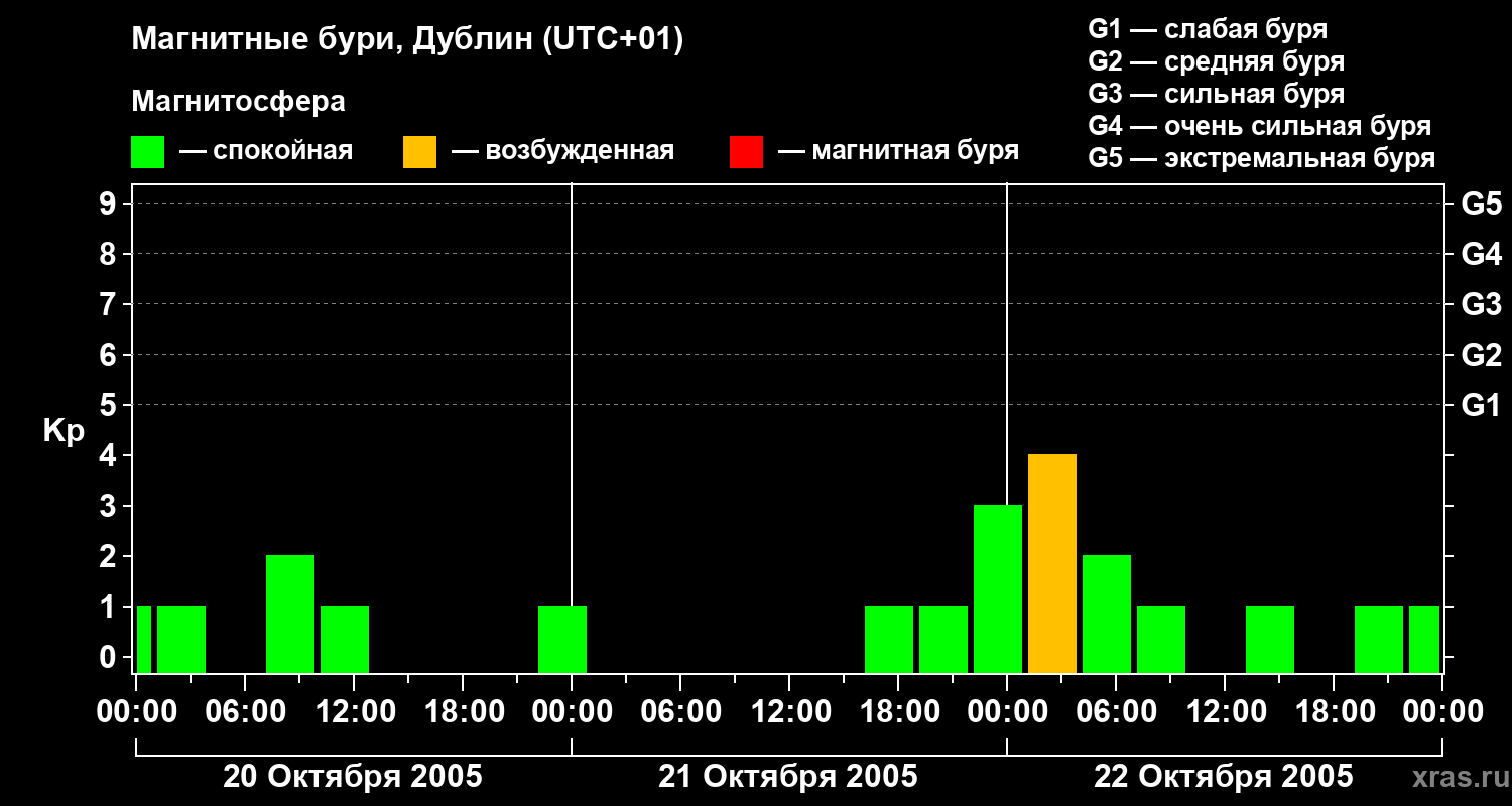 Изменения геомагнитного индекса Kp с 20 по 22 октября 2005 года для средних широт