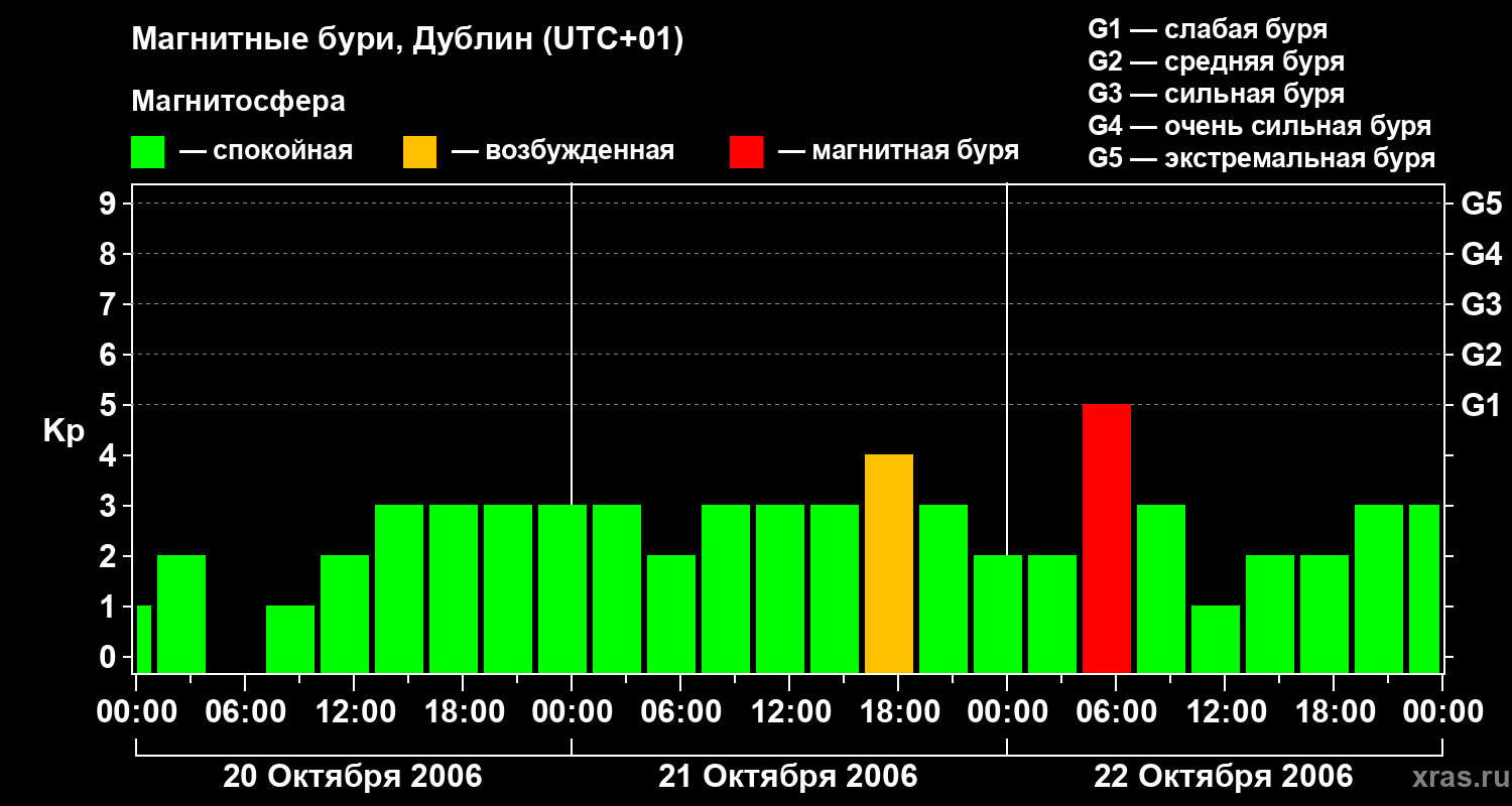 Изменения геомагнитного индекса Kp с 20 по 22 октября 2006 года для средних широт
