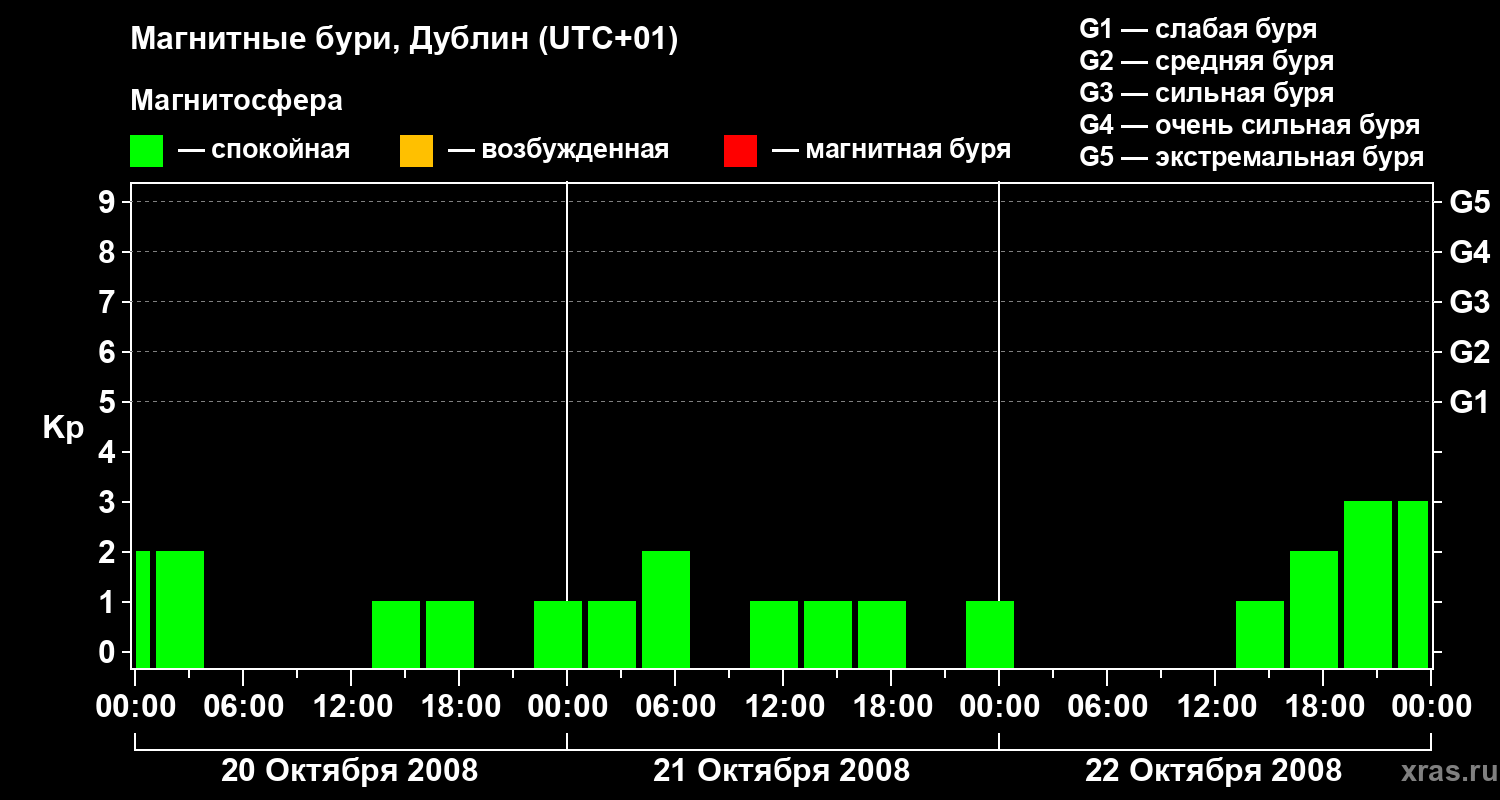 Изменения геомагнитного индекса Kp с 20 по 22 октября 2008 года для средних широт