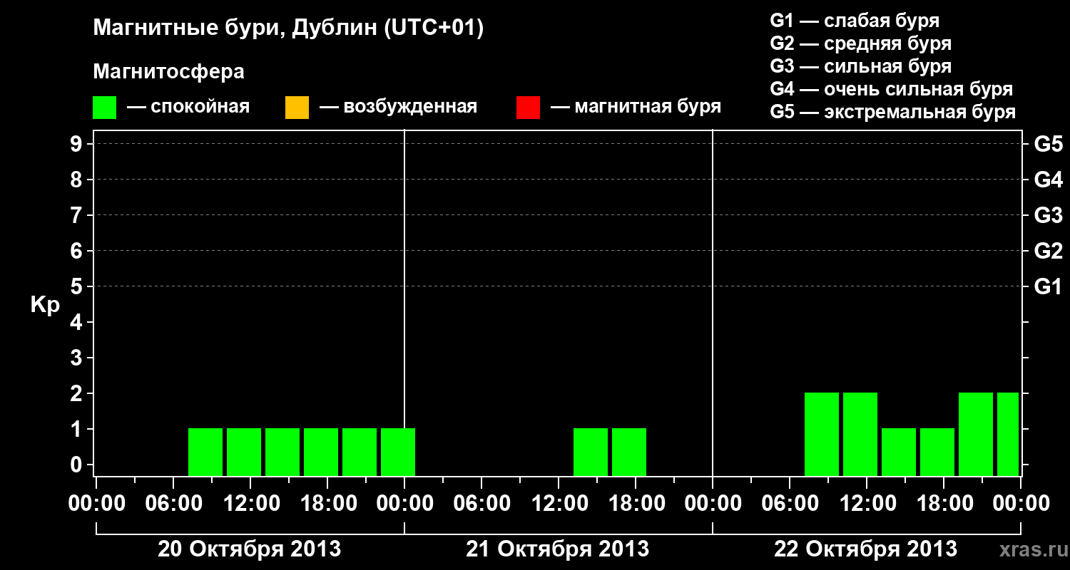 Изменения геомагнитного индекса Kp с 20 по 22 октября 2013 года для средних широт