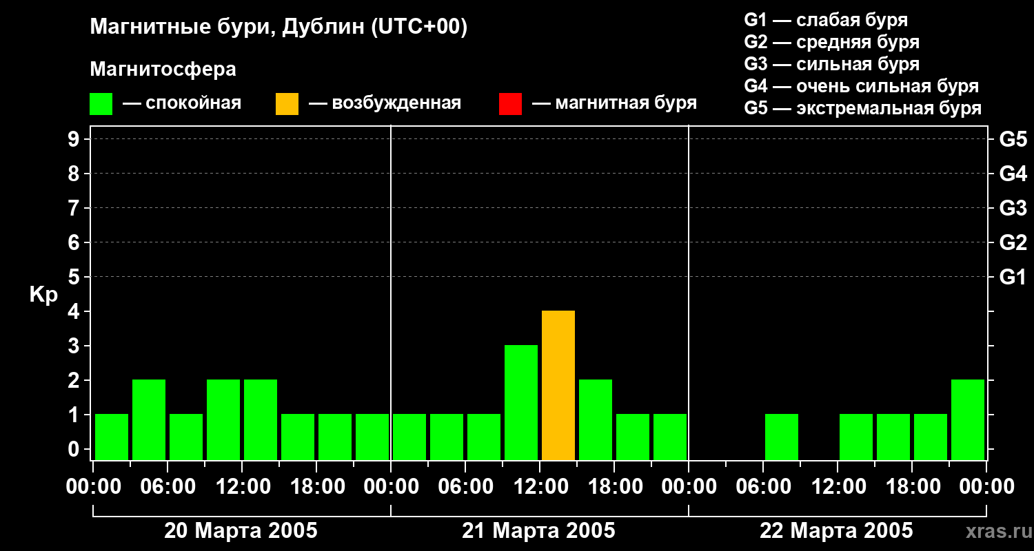 Изменения геомагнитного индекса Kp с 20 по 22 марта 2005 года для средних широт