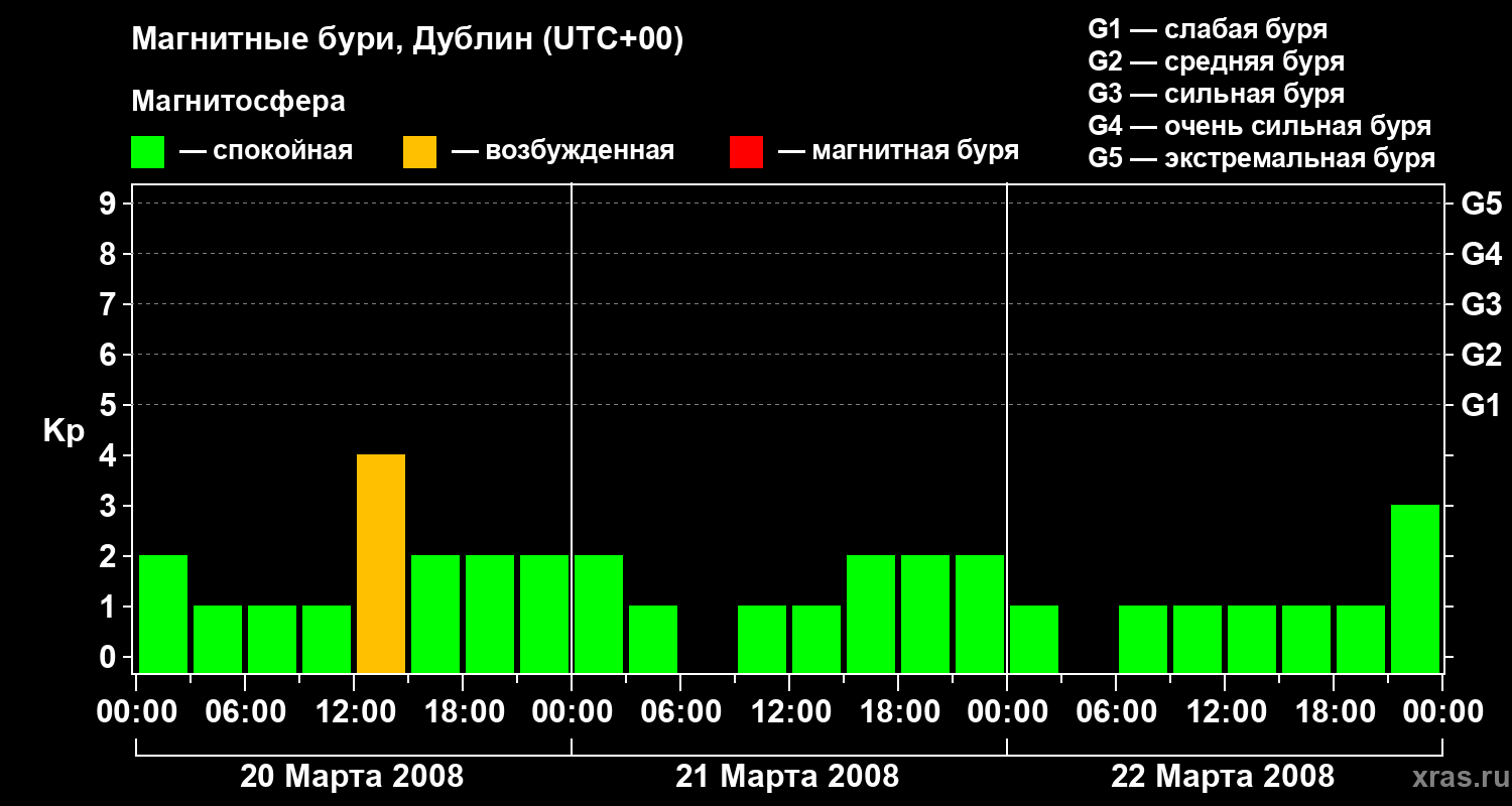 Изменения геомагнитного индекса Kp с 20 по 22 марта 2008 года для средних широт
