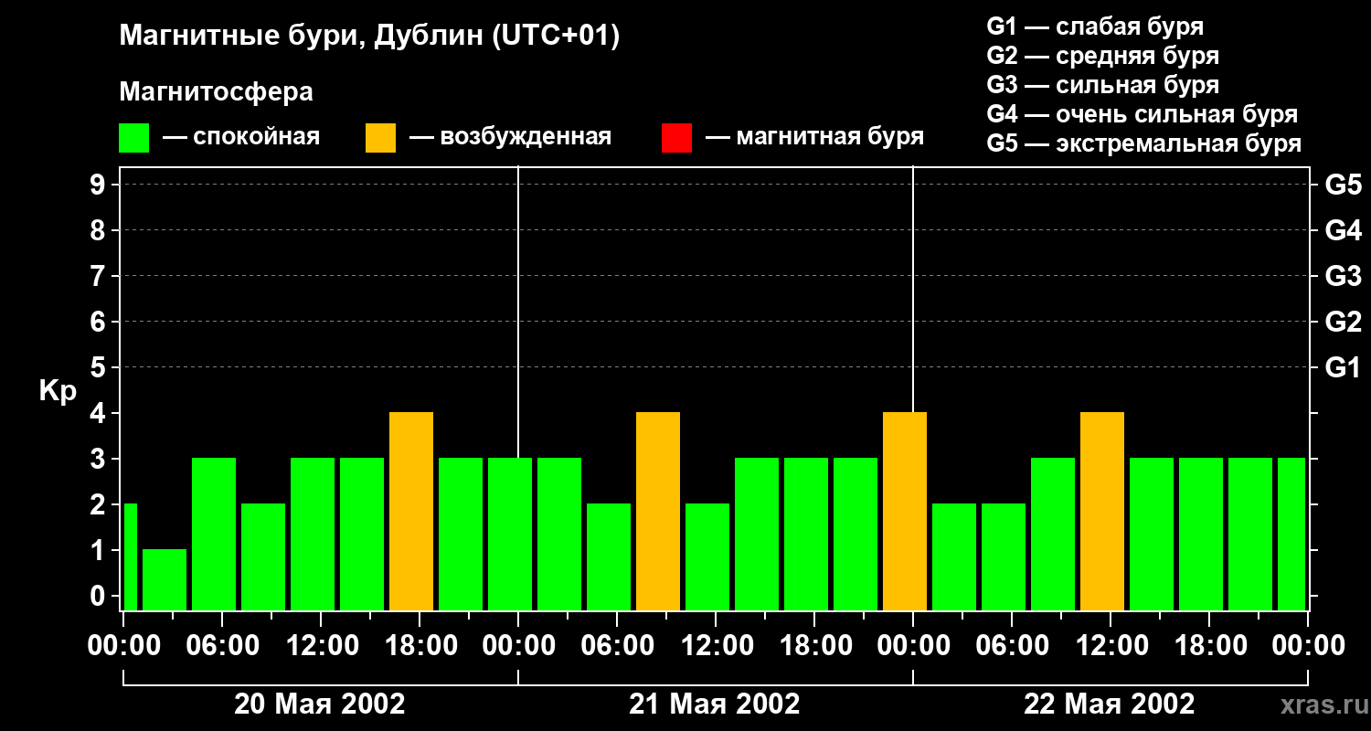 Изменения геомагнитного индекса Kp с 20 по 22 мая 2002 года для средних широт