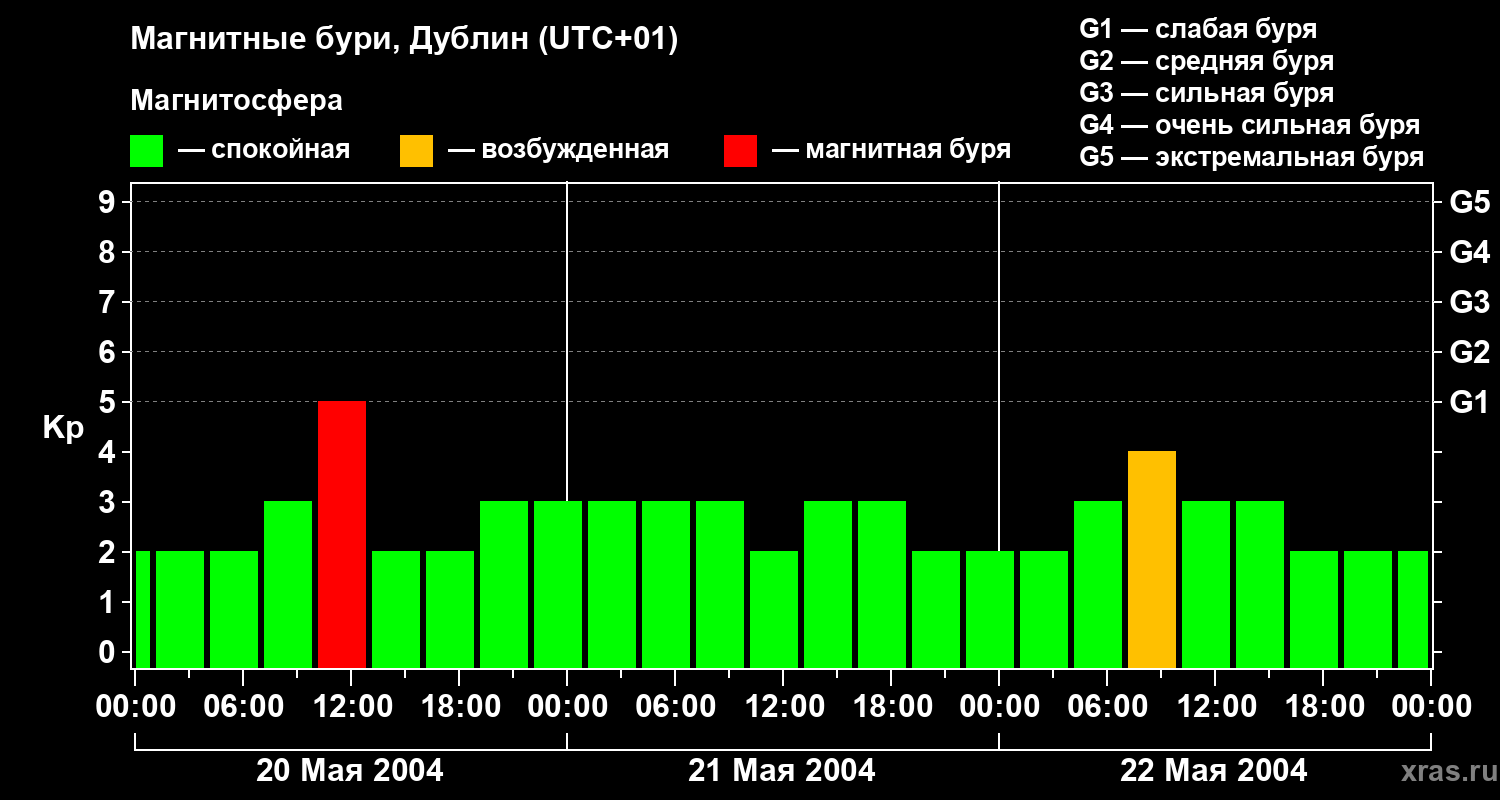 Изменения геомагнитного индекса Kp с 20 по 22 мая 2004 года для средних широт