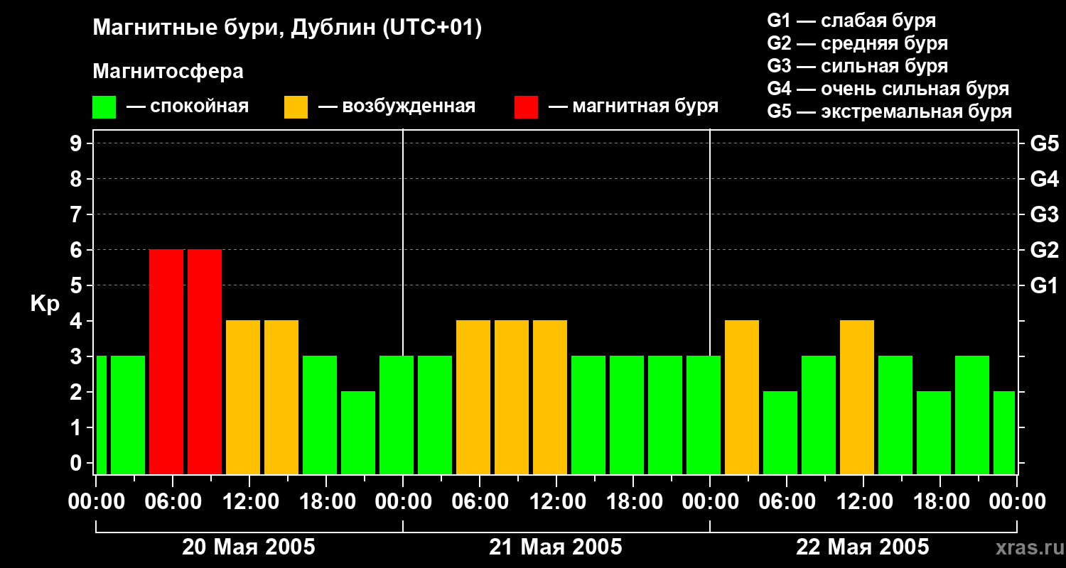 Изменения геомагнитного индекса Kp с 20 по 22 мая 2005 года для средних широт