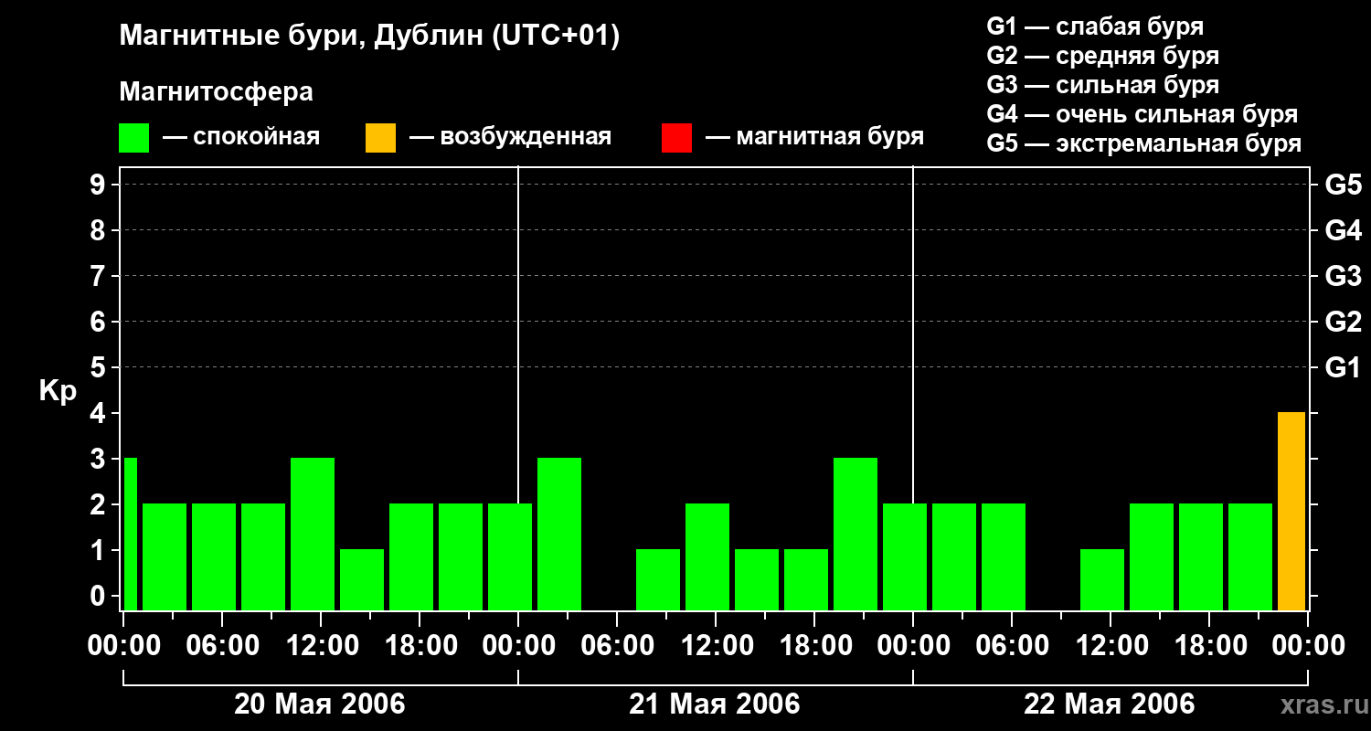 Изменения геомагнитного индекса Kp с 20 по 22 мая 2006 года для средних широт