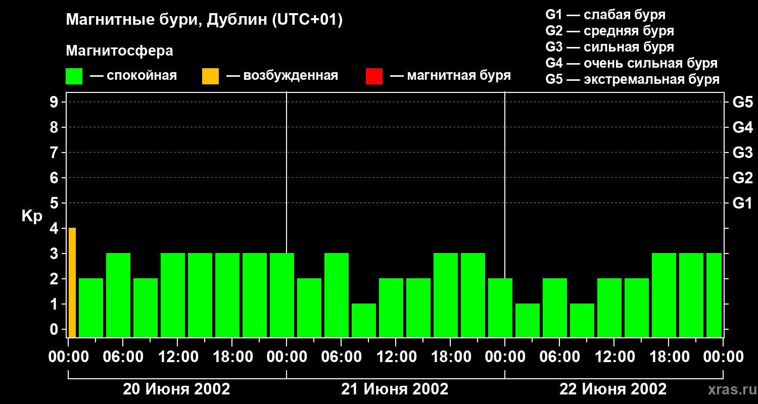 Изменения геомагнитного индекса Kp с 20 по 22 июня 2002 года для средних широт