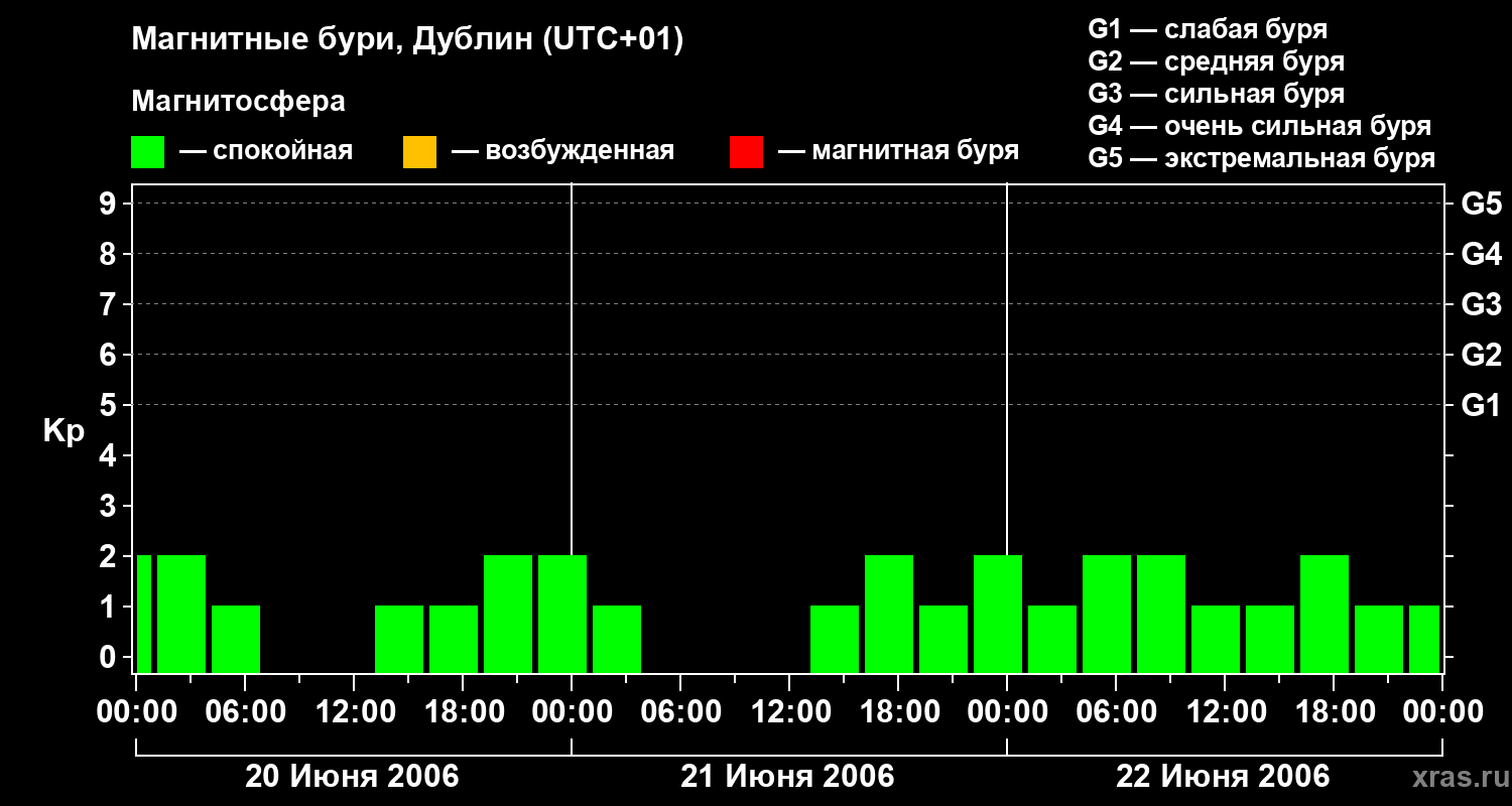 Изменения геомагнитного индекса Kp с 20 по 22 июня 2006 года для средних широт
