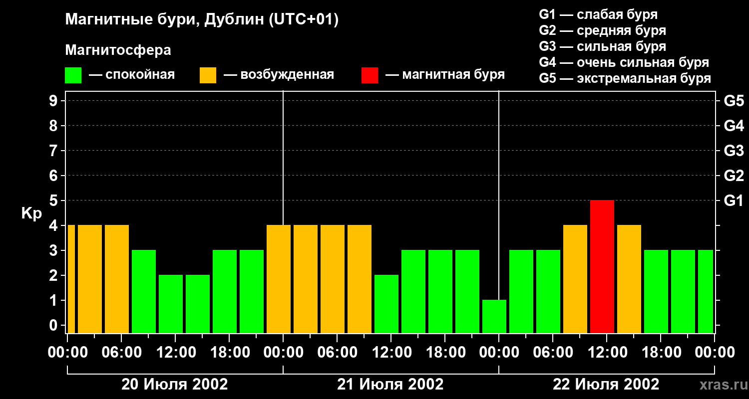 Изменения геомагнитного индекса Kp с 20 по 22 июля 2002 года для средних широт