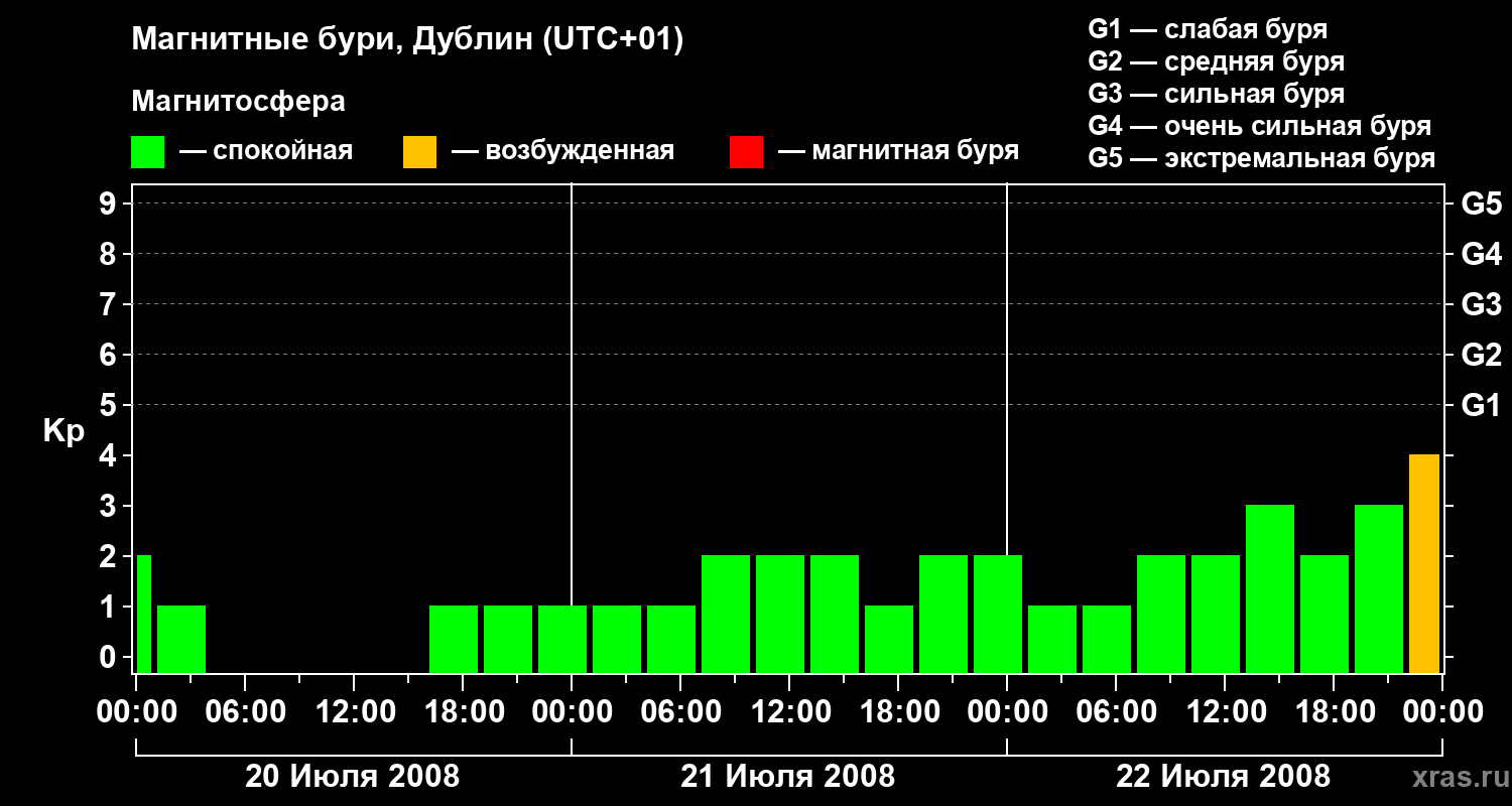 Изменения геомагнитного индекса Kp с 20 по 22 июля 2008 года для средних широт