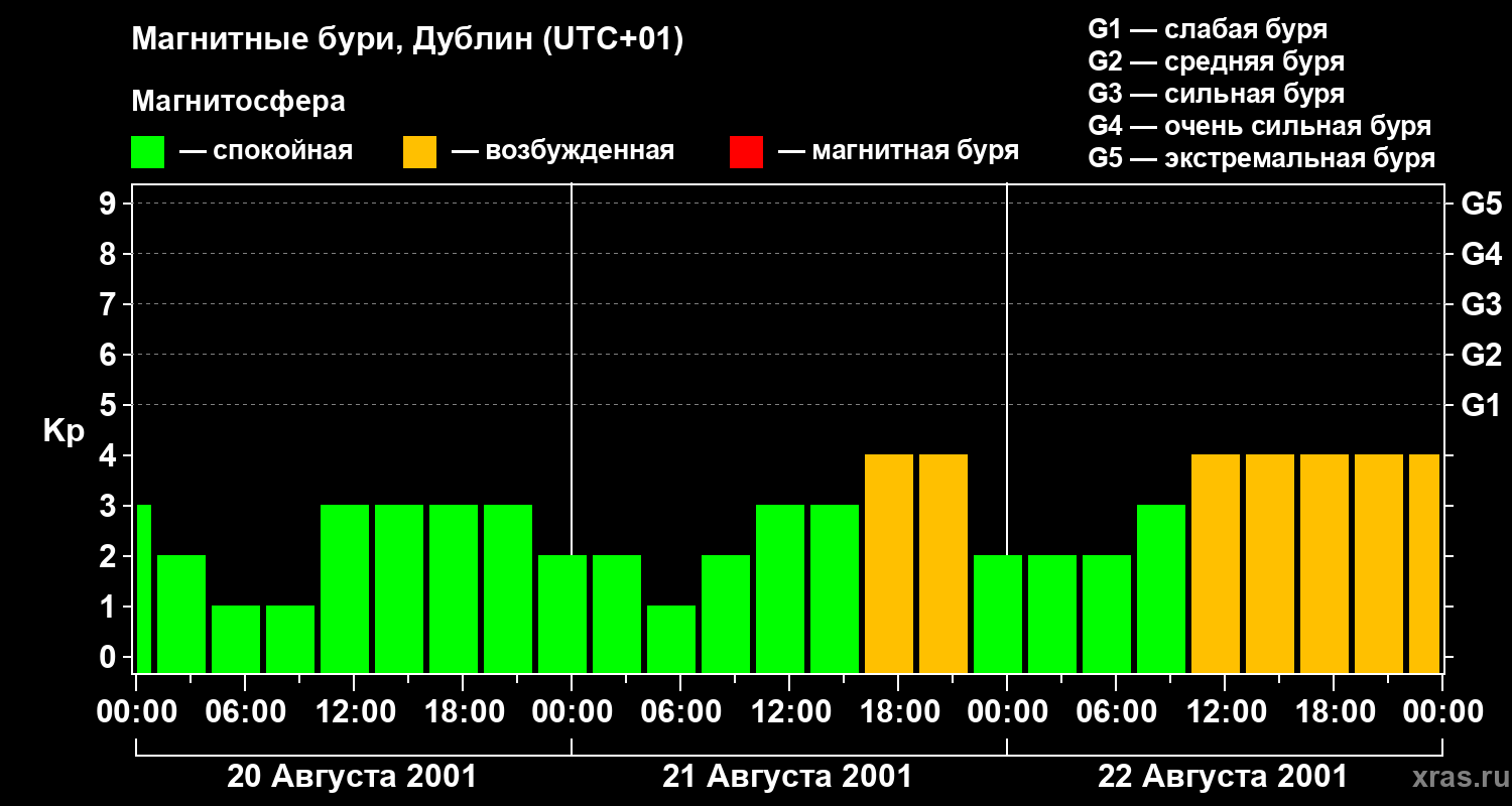 Изменения геомагнитного индекса Kp с 20 по 22 августа 2001 года для средних широт