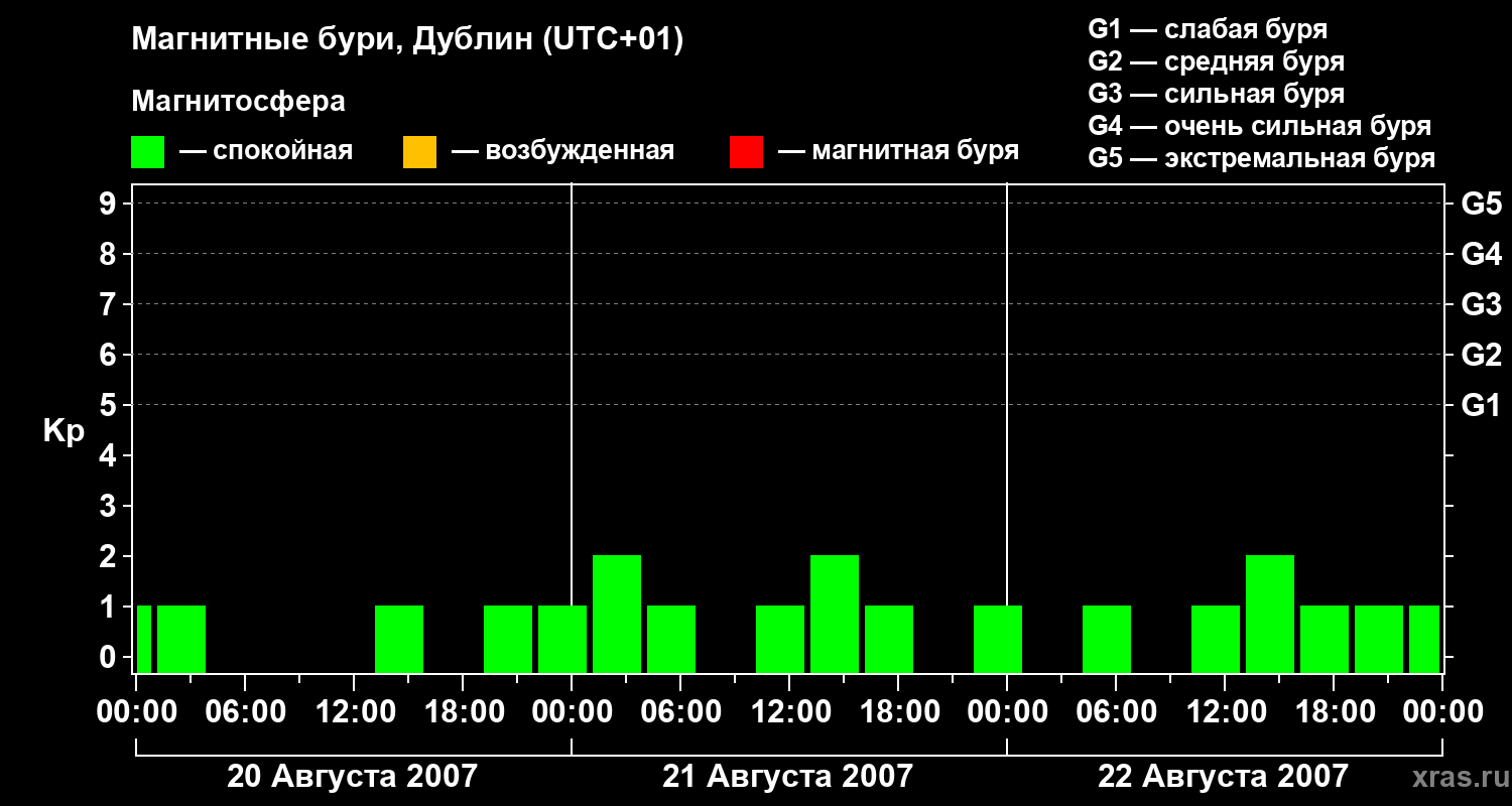 Изменения геомагнитного индекса Kp с 20 по 22 августа 2007 года для средних широт