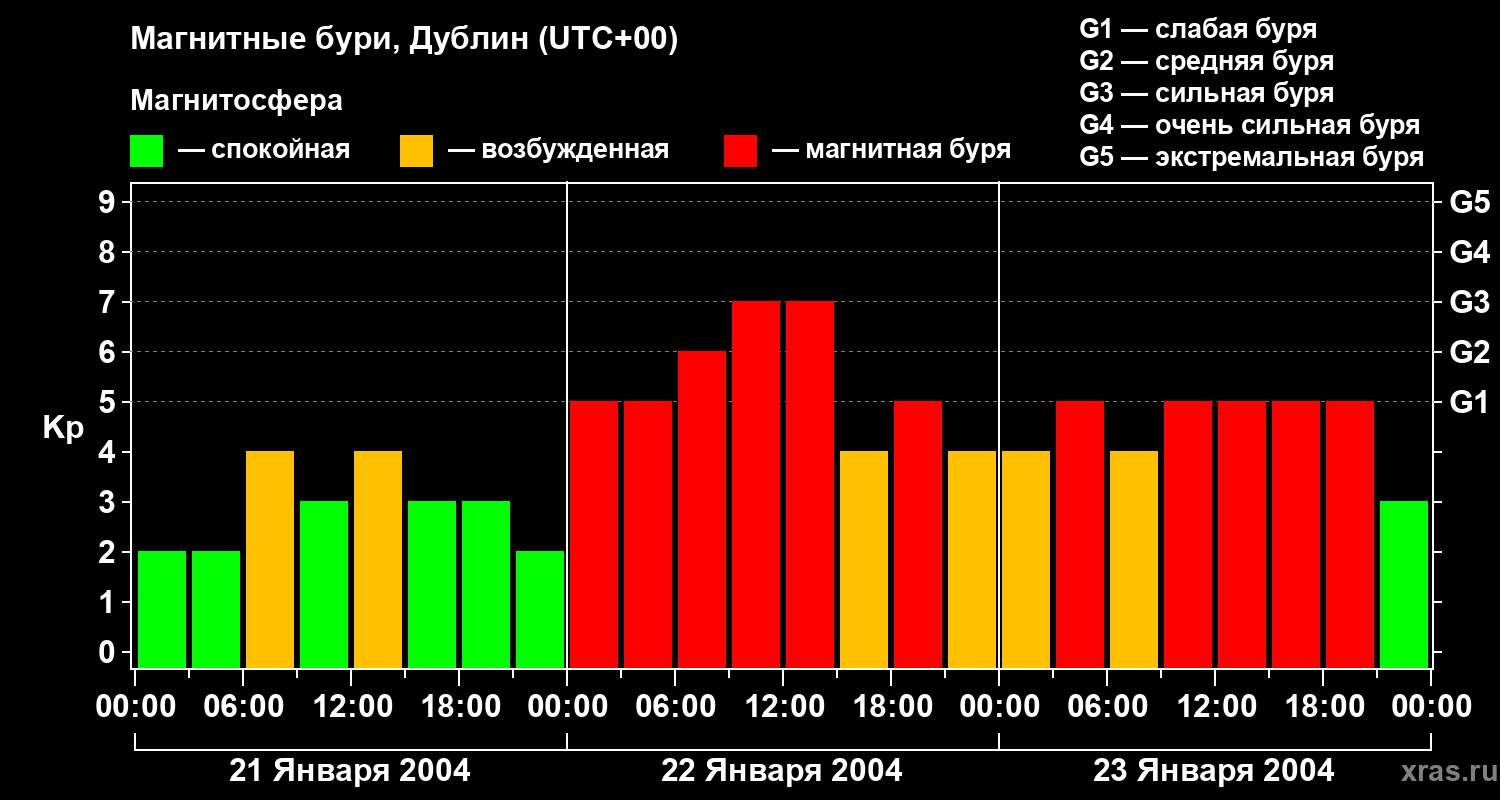 Изменения геомагнитного индекса Kp с 21 по 23 января 2004 года для средних широт