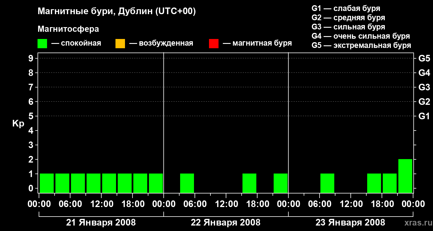 Изменения геомагнитного индекса Kp с 21 по 23 января 2008 года для средних широт