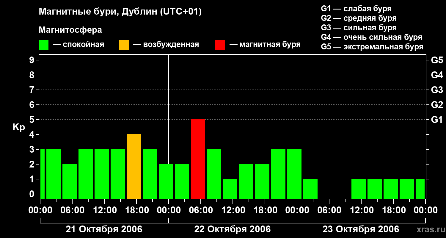Изменения геомагнитного индекса Kp с 21 по 23 октября 2006 года для средних широт