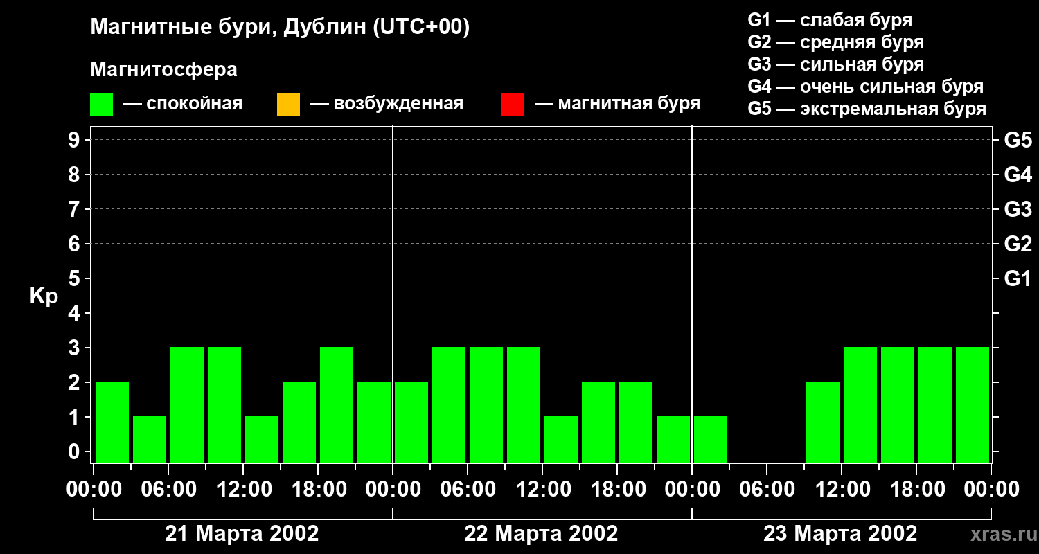 Изменения геомагнитного индекса Kp с 21 по 23 марта 2002 года для средних широт