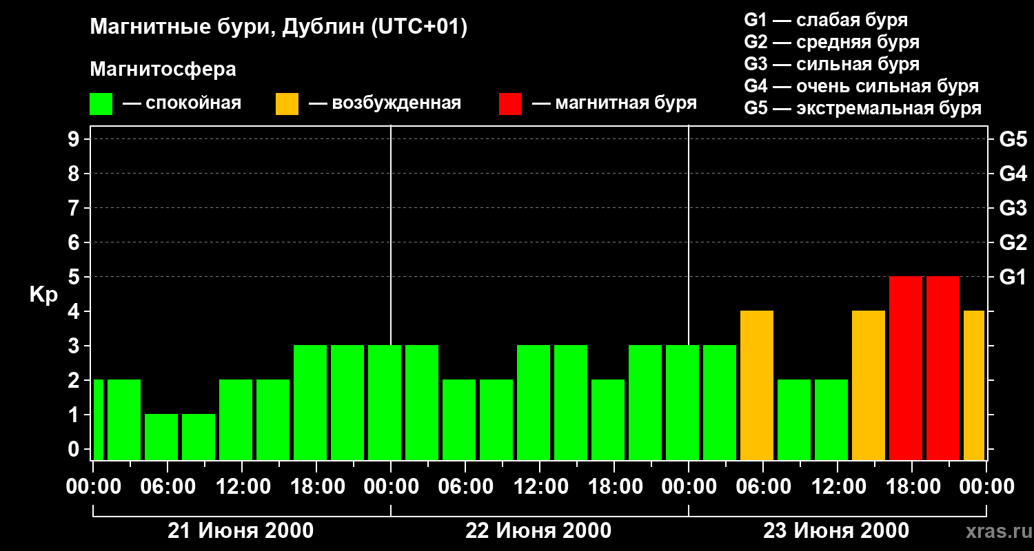Изменения геомагнитного индекса Kp с 21 по 23 июня 2000 года для средних широт