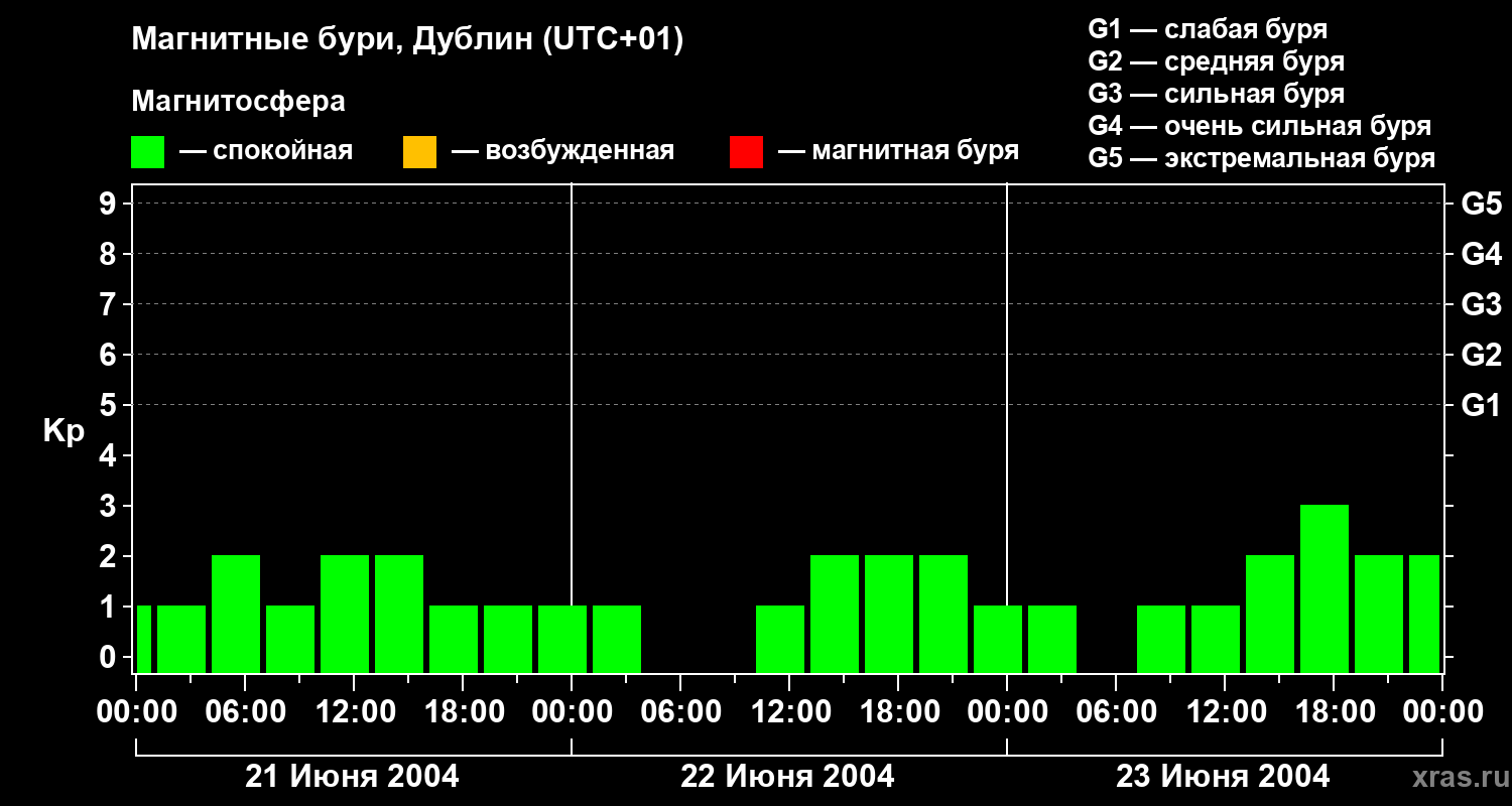Изменения геомагнитного индекса Kp с 21 по 23 июня 2004 года для средних широт