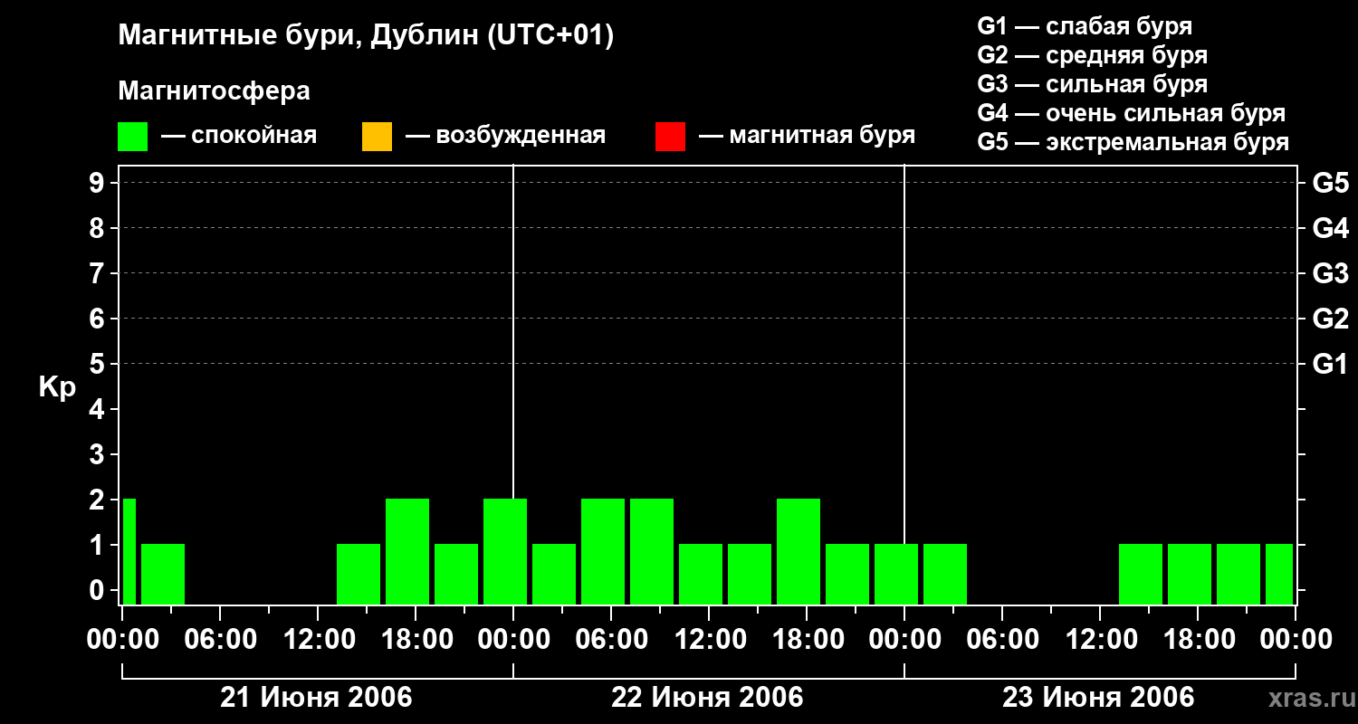 Изменения геомагнитного индекса Kp с 21 по 23 июня 2006 года для средних широт