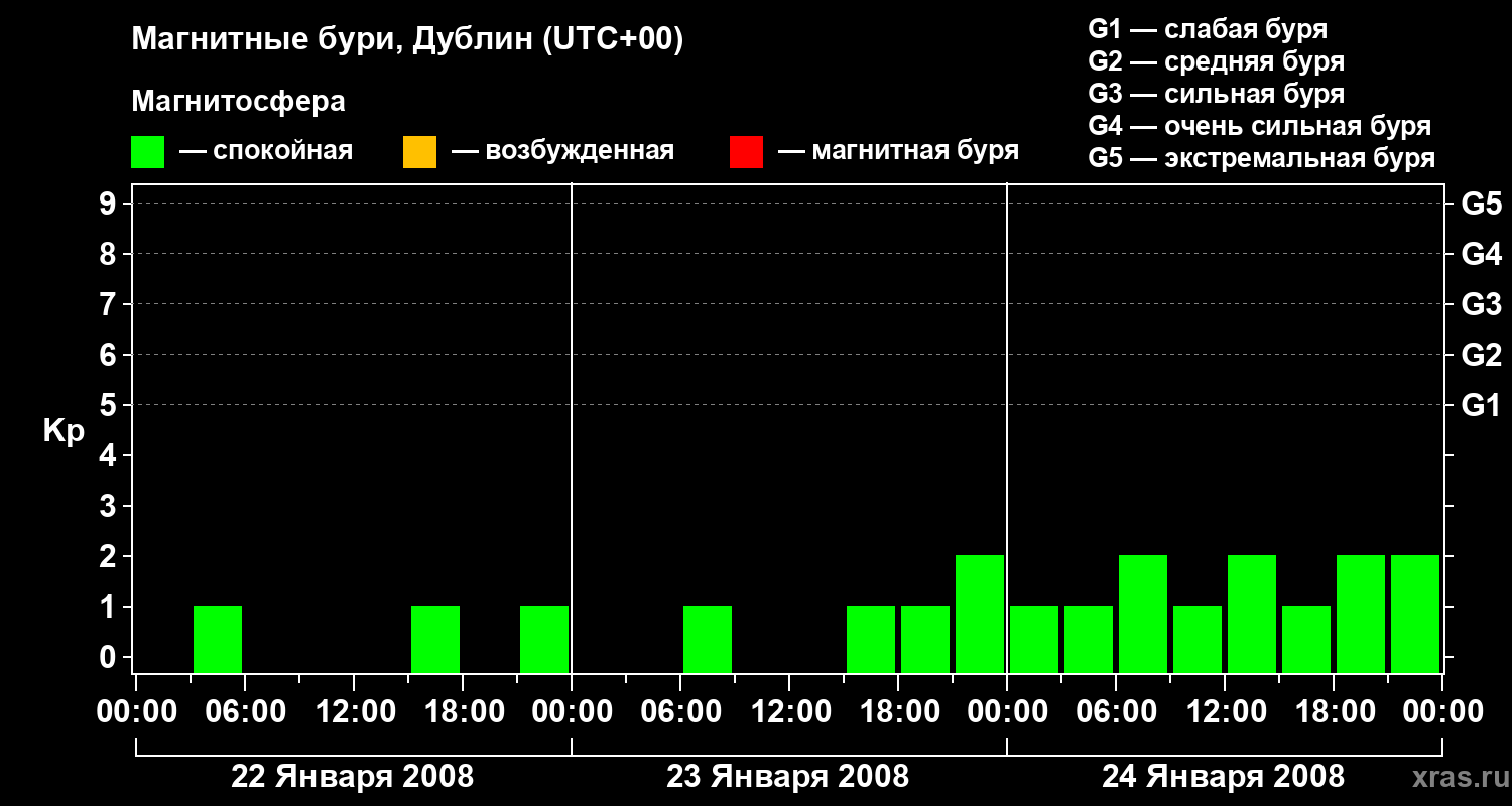 Изменения геомагнитного индекса Kp с 22 по 24 января 2008 года для средних широт