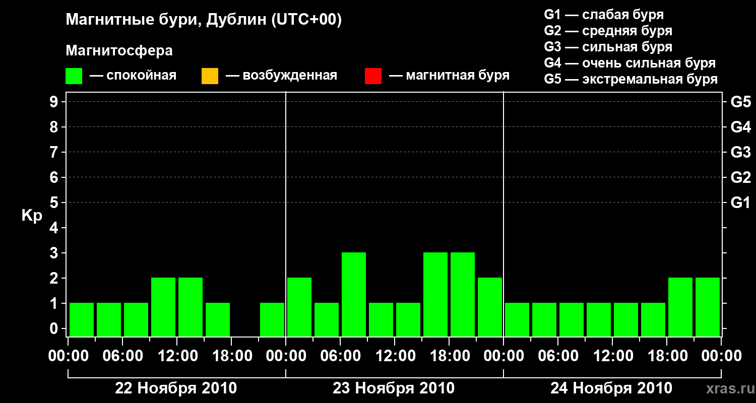 Изменения геомагнитного индекса Kp с 22 по 24 ноября 2010 года для средних широт