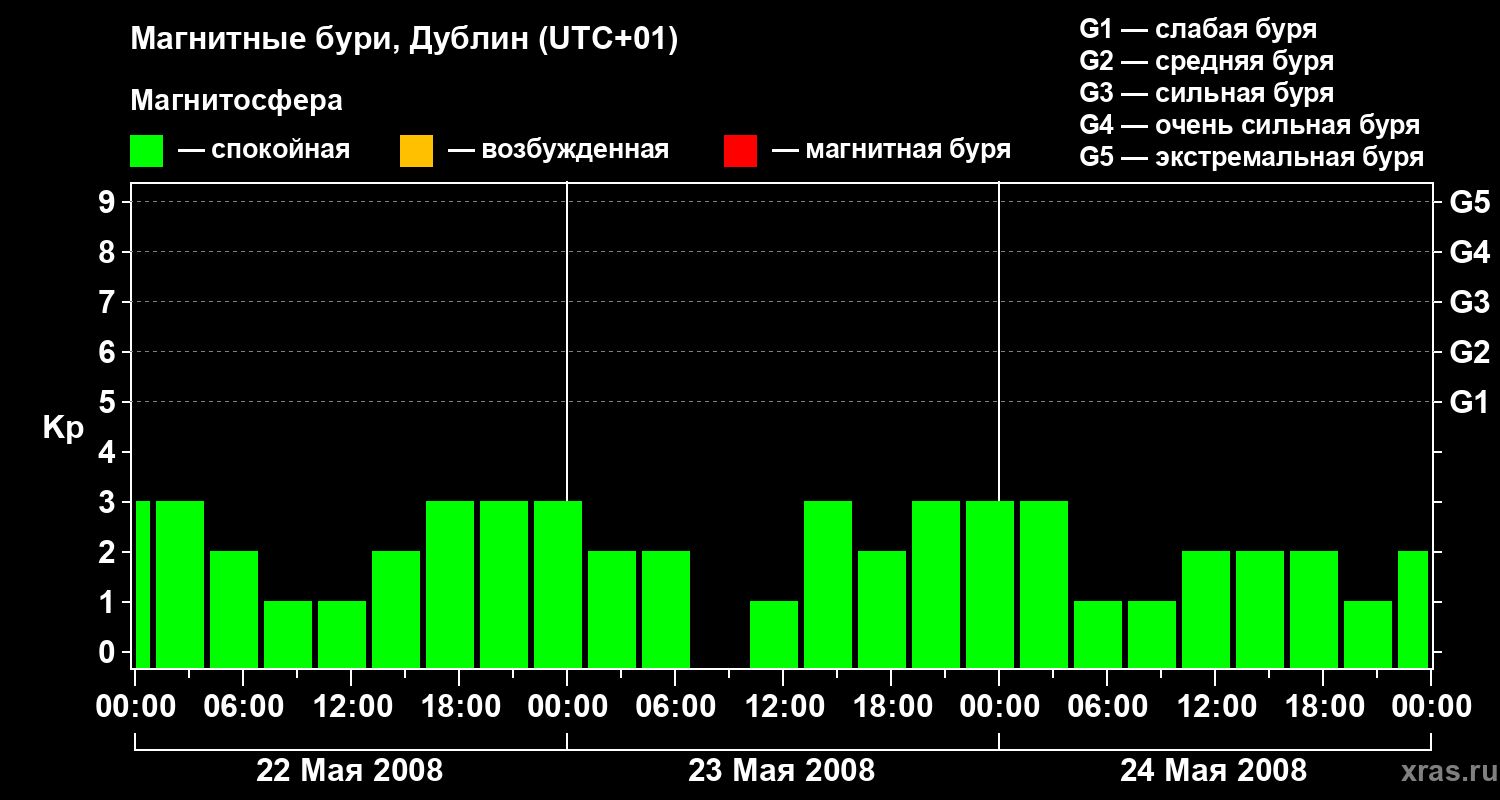 Изменения геомагнитного индекса Kp с 22 по 24 мая 2008 года для средних широт