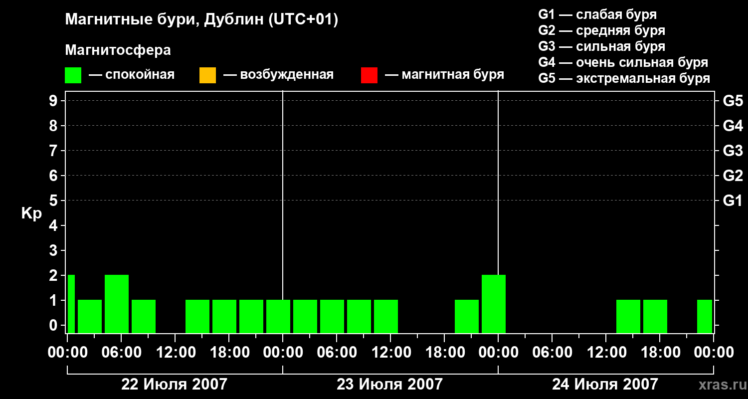 Изменения геомагнитного индекса Kp с 22 по 24 июля 2007 года для средних широт
