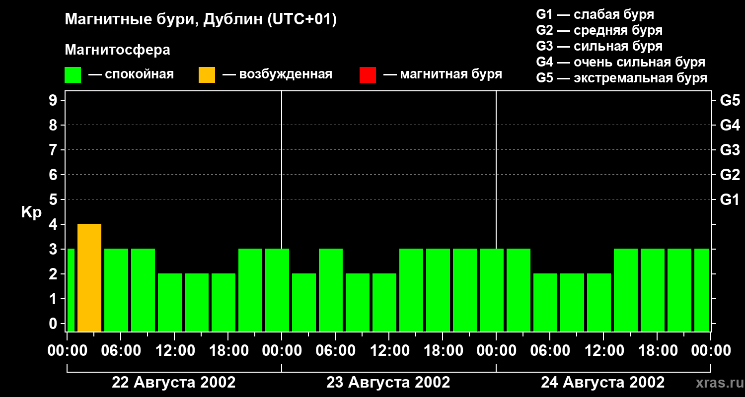 Изменения геомагнитного индекса Kp с 22 по 24 августа 2002 года для средних широт