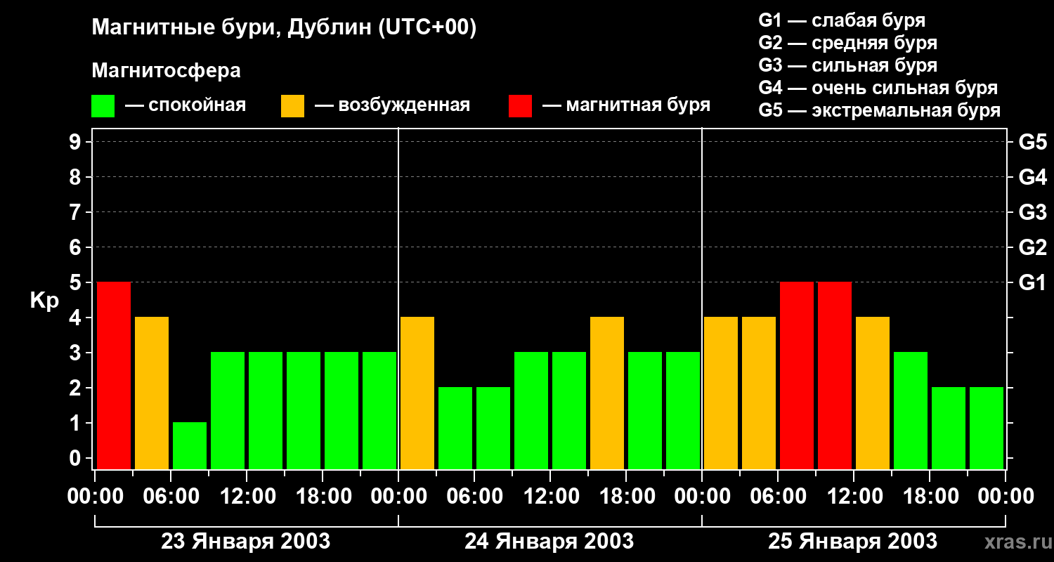 Изменения геомагнитного индекса Kp с 23 по 25 января 2003 года для средних широт