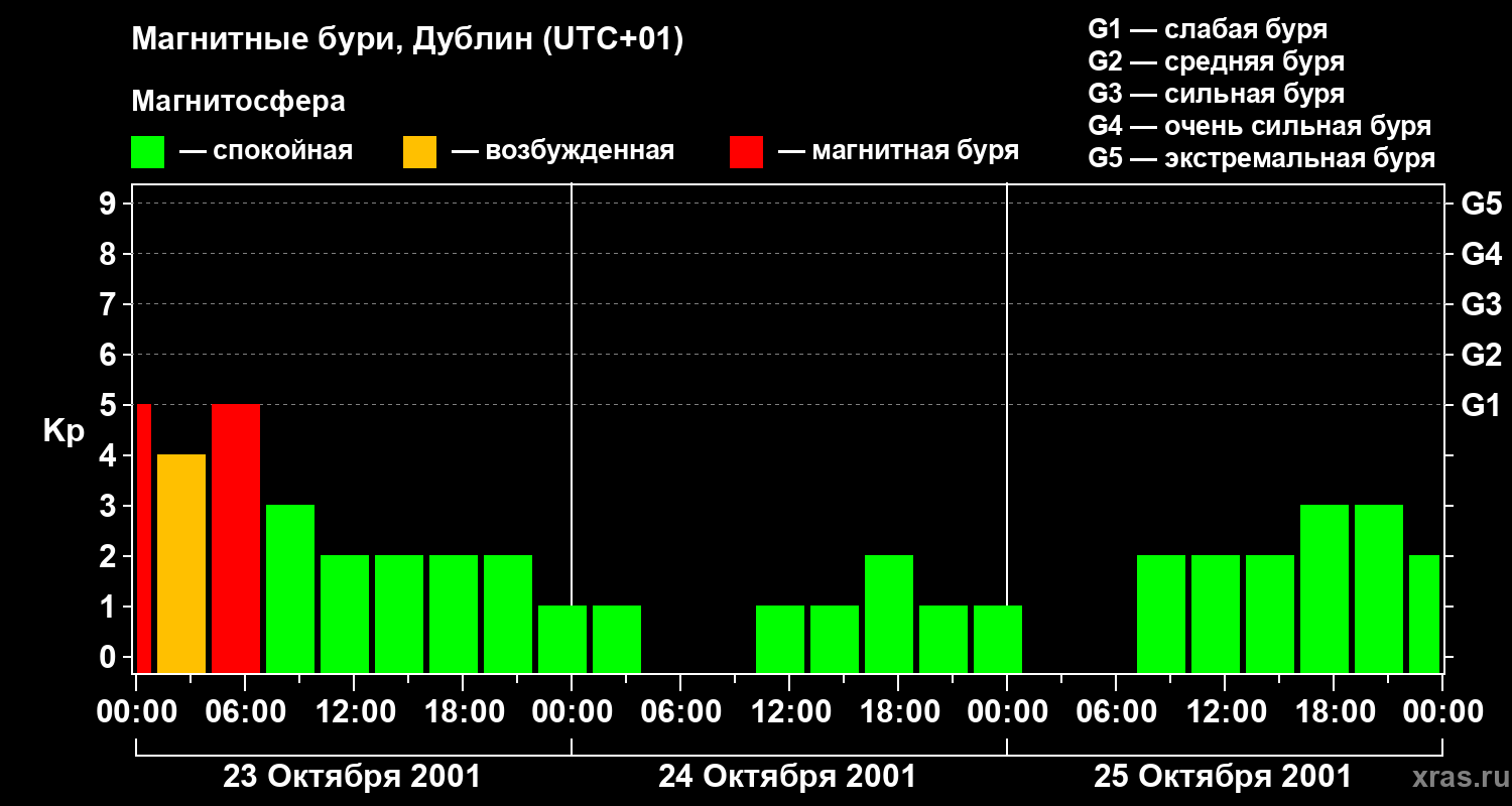 Изменения геомагнитного индекса Kp с 23 по 25 октября 2001 года для средних широт