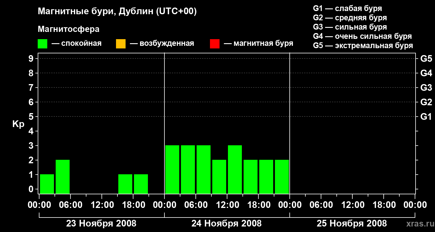 Изменения геомагнитного индекса Kp с 23 по 25 ноября 2008 года для средних широт