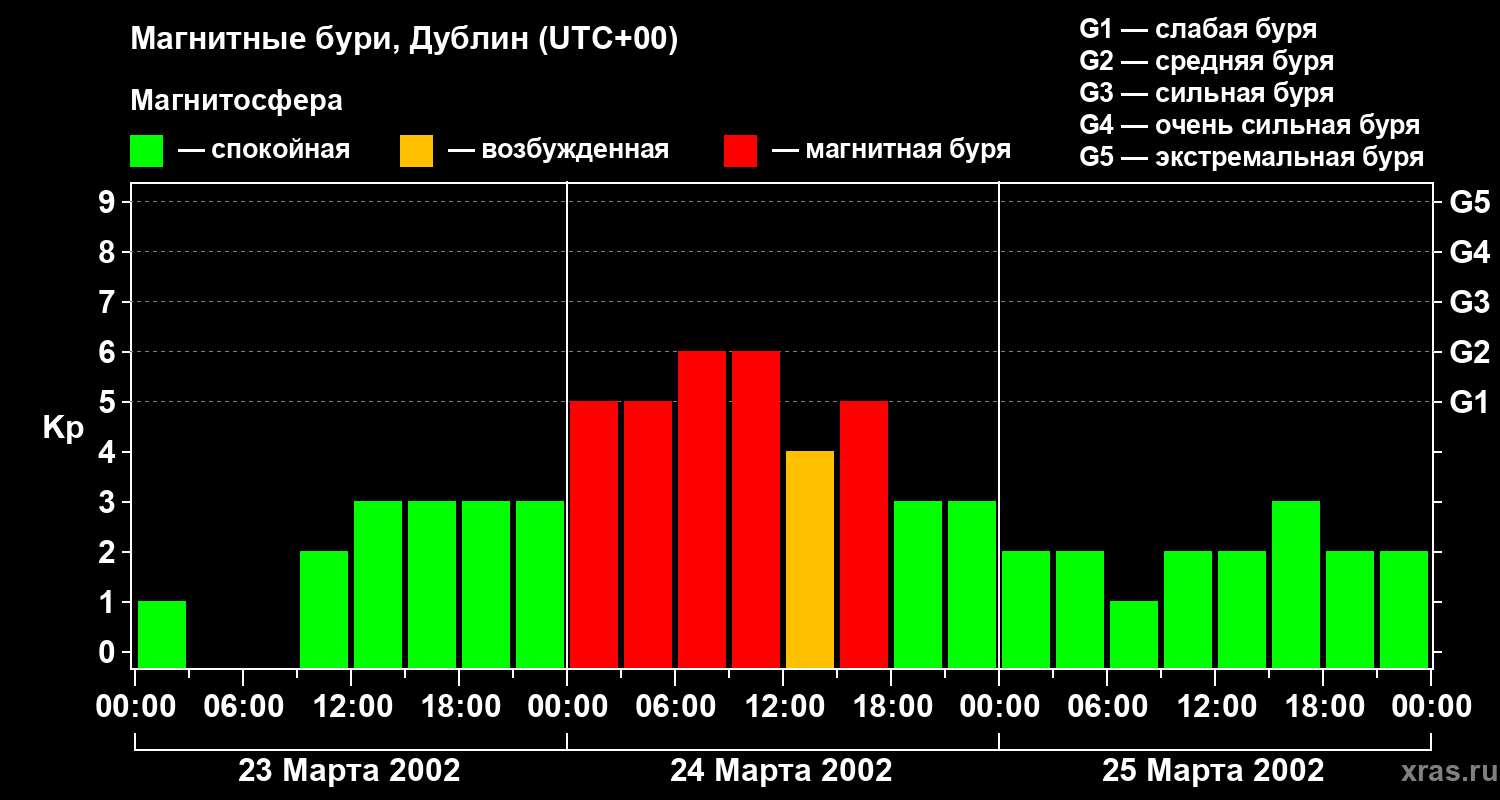 Изменения геомагнитного индекса Kp с 23 по 25 марта 2002 года для средних широт