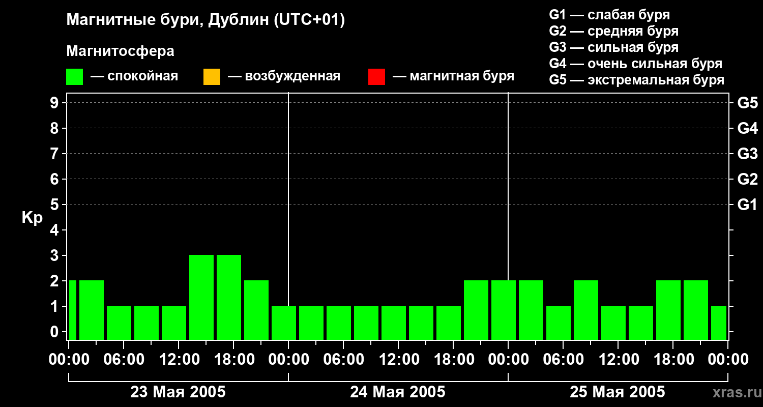 Изменения геомагнитного индекса Kp с 23 по 25 мая 2005 года для средних широт