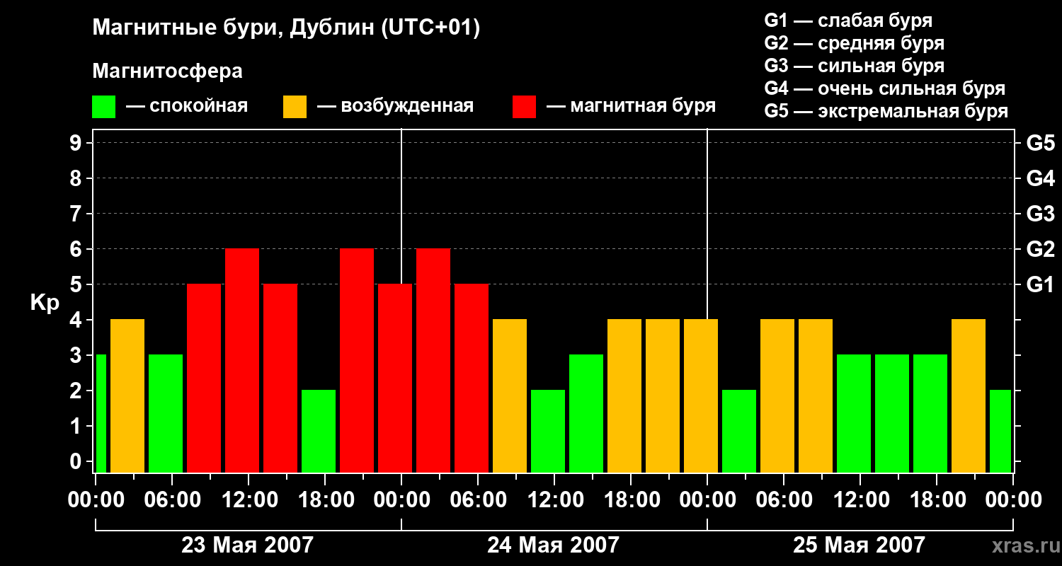 Изменения геомагнитного индекса Kp с 23 по 25 мая 2007 года для средних широт