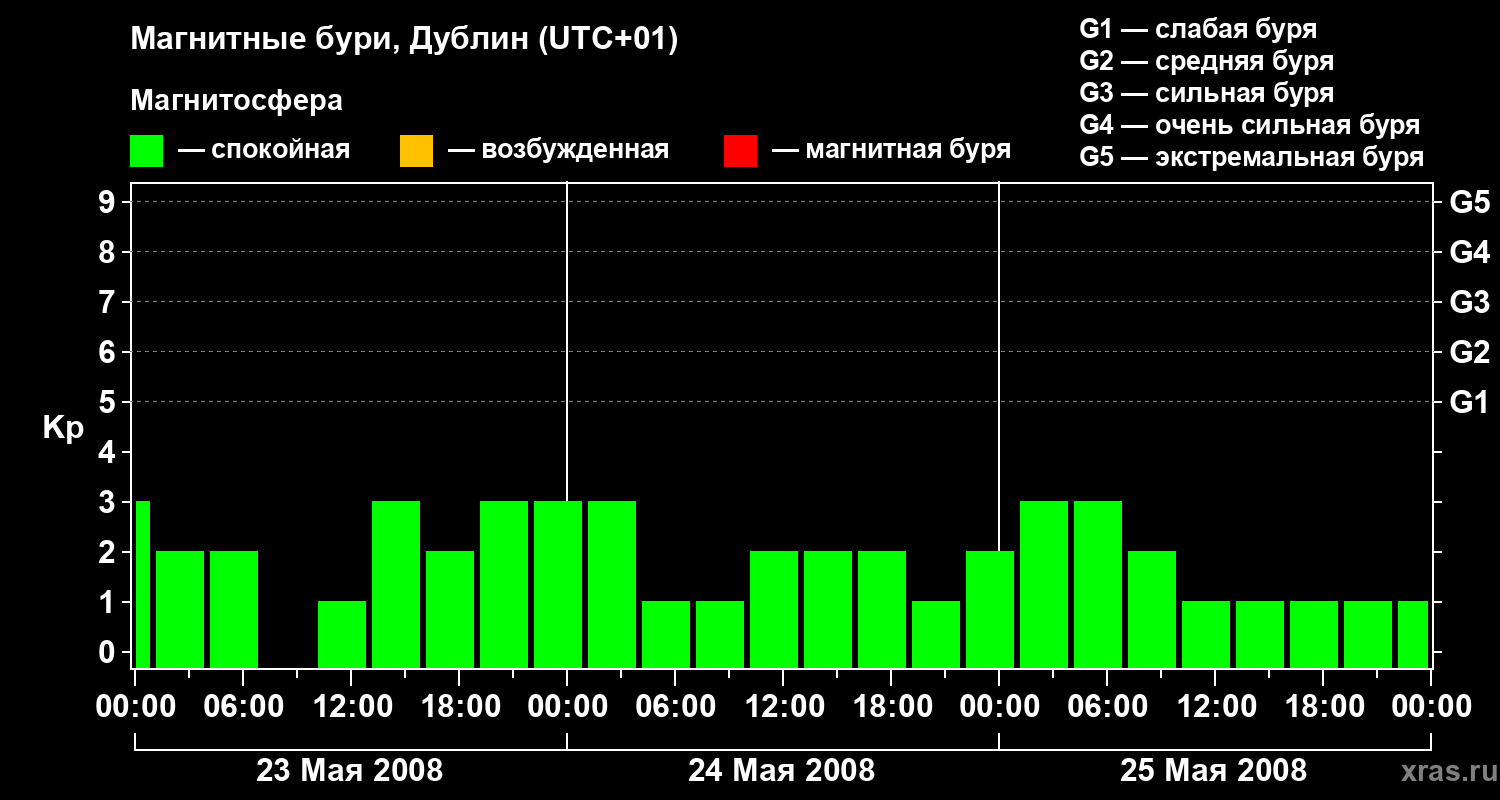 Изменения геомагнитного индекса Kp с 23 по 25 мая 2008 года для средних широт