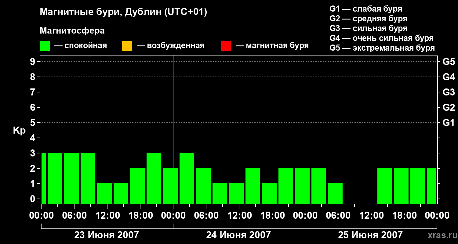 Изменения геомагнитного индекса Kp с 23 по 25 июня 2007 года для средних широт