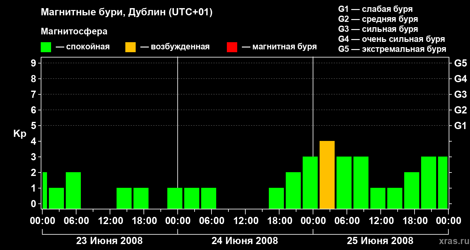 Изменения геомагнитного индекса Kp с 23 по 25 июня 2008 года для средних широт