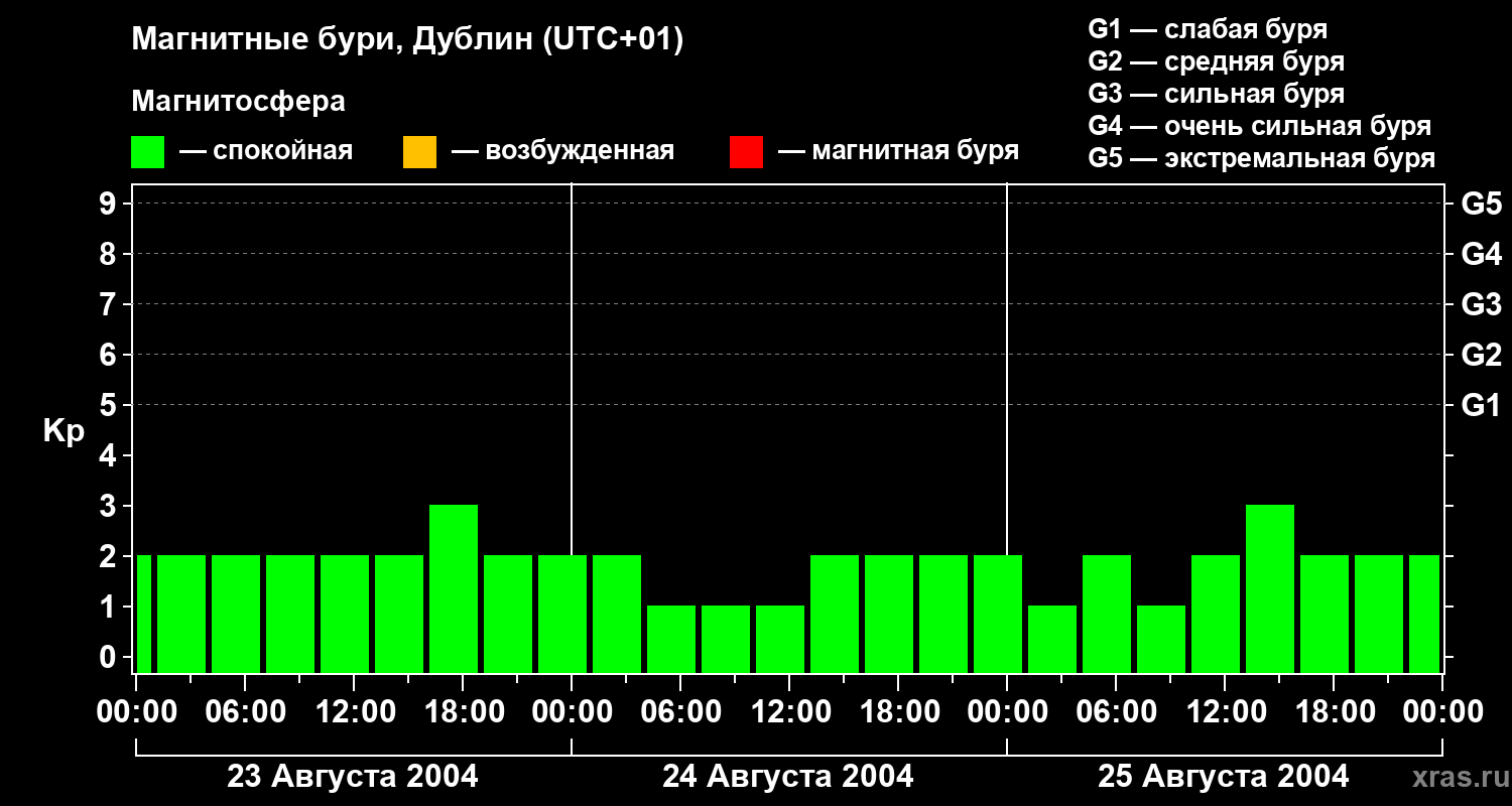 Изменения геомагнитного индекса Kp с 23 по 25 августа 2004 года для средних широт