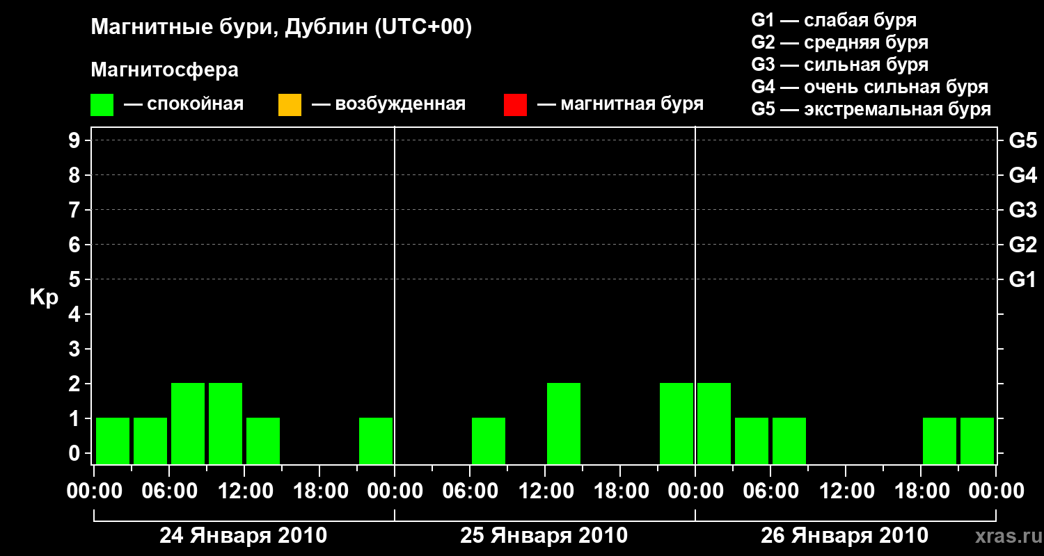Изменения геомагнитного индекса Kp с 24 по 26 января 2010 года для средних широт