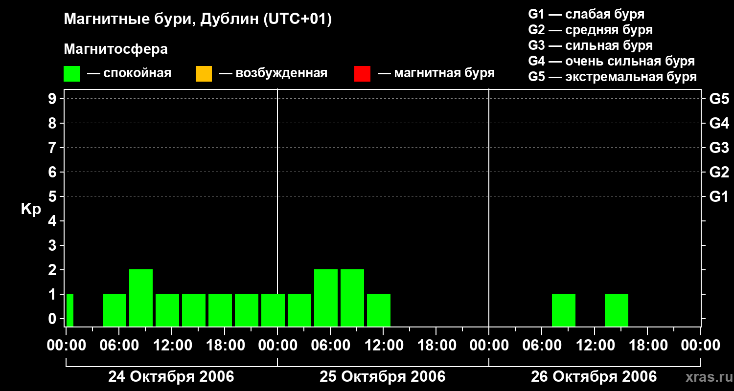 Изменения геомагнитного индекса Kp с 24 по 26 октября 2006 года для средних широт