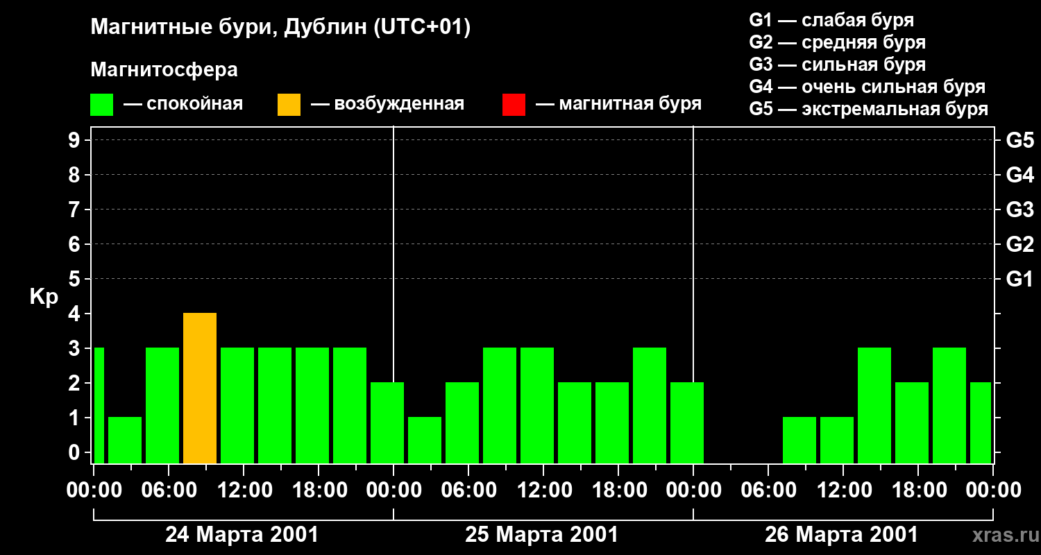 Изменения геомагнитного индекса Kp с 24 по 26 марта 2001 года для средних широт