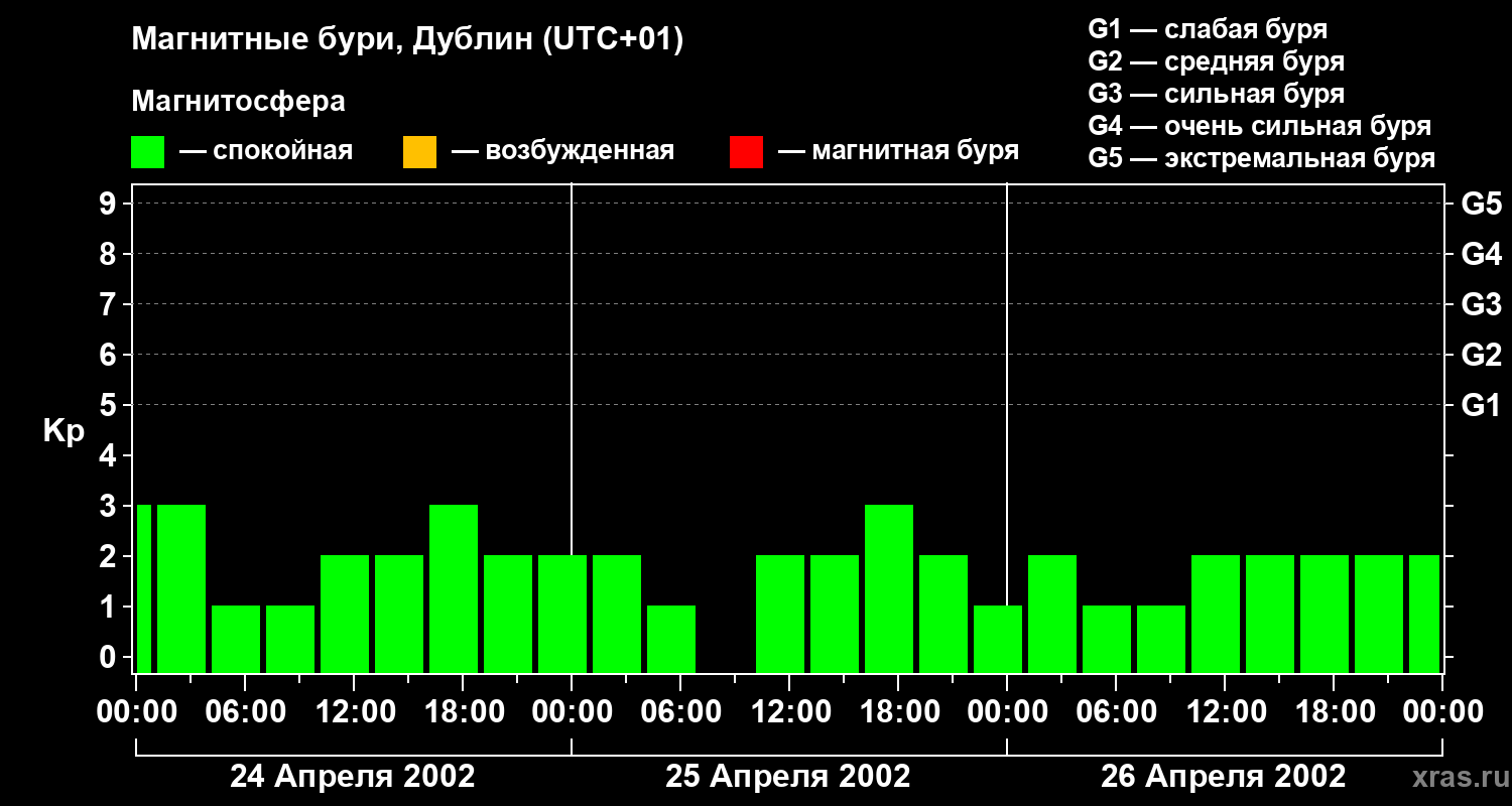 Изменения геомагнитного индекса Kp с 24 по 26 апреля 2002 года для средних широт