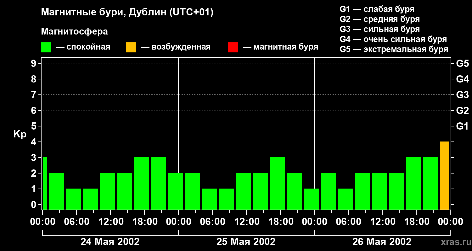 Изменения геомагнитного индекса Kp с 24 по 26 мая 2002 года для средних широт
