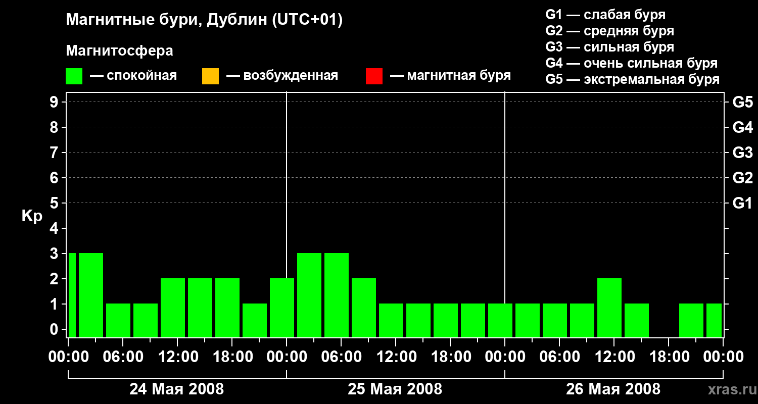 Изменения геомагнитного индекса Kp с 24 по 26 мая 2008 года для средних широт