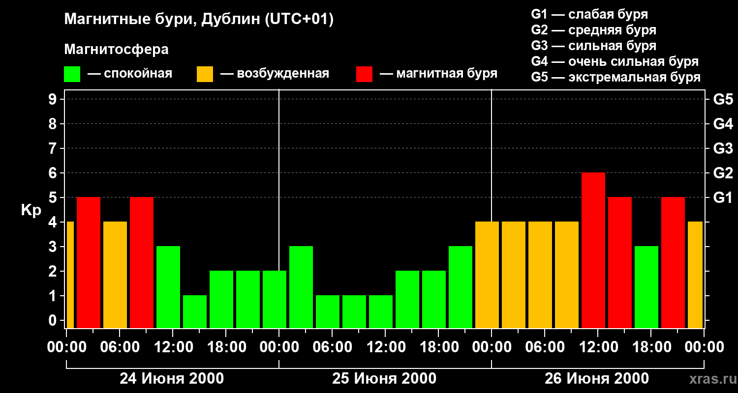 Изменения геомагнитного индекса Kp с 24 по 26 июня 2000 года для средних широт