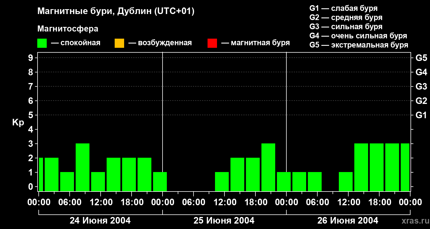 Изменения геомагнитного индекса Kp с 24 по 26 июня 2004 года для средних широт