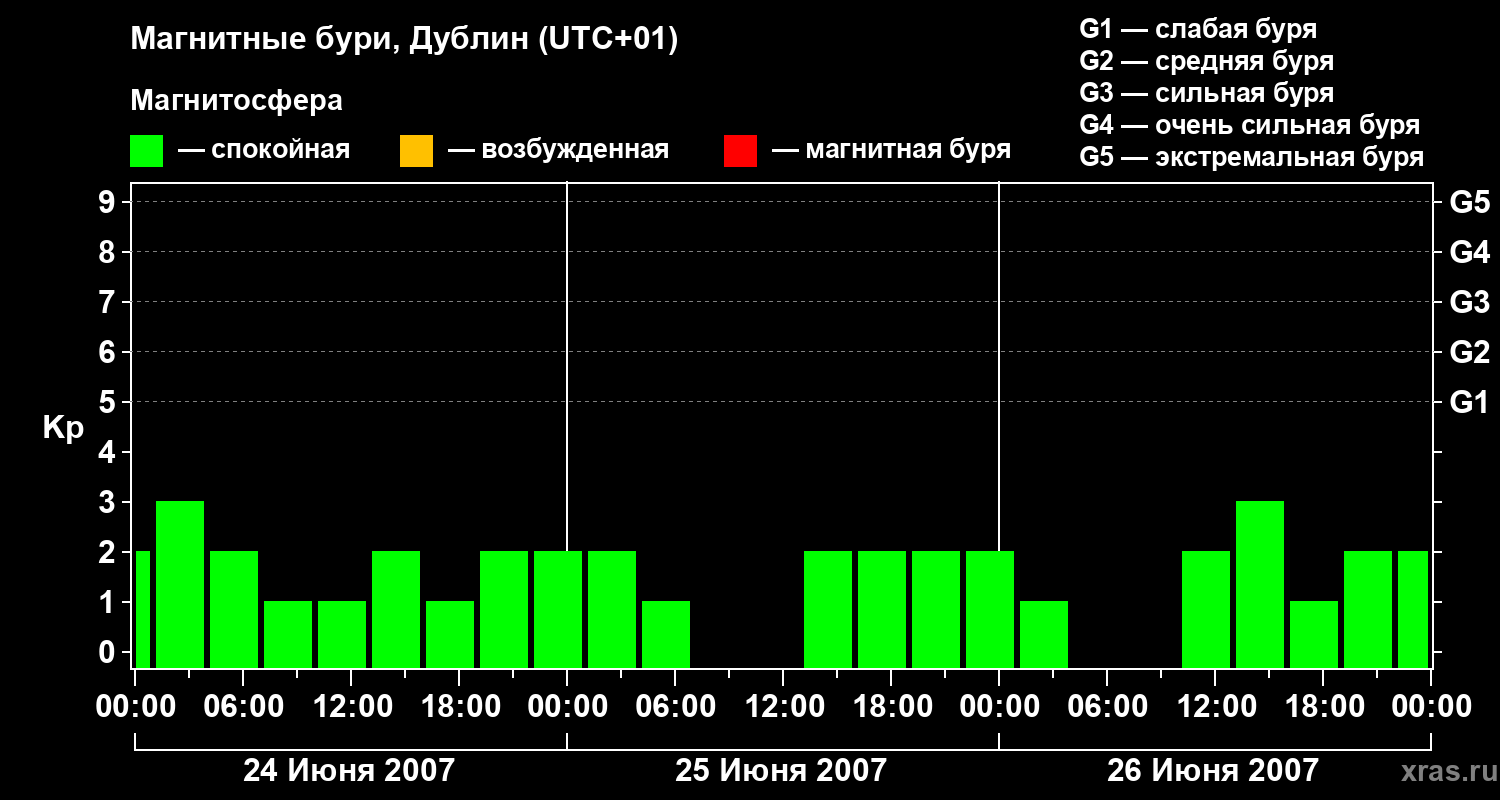 Изменения геомагнитного индекса Kp с 24 по 26 июня 2007 года для средних широт
