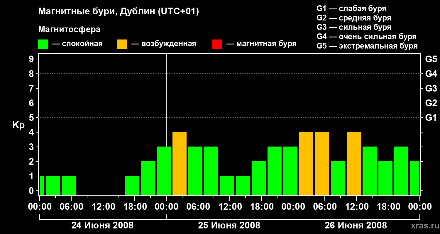 Изменения геомагнитного индекса Kp с 24 по 26 июня 2008 года для средних широт