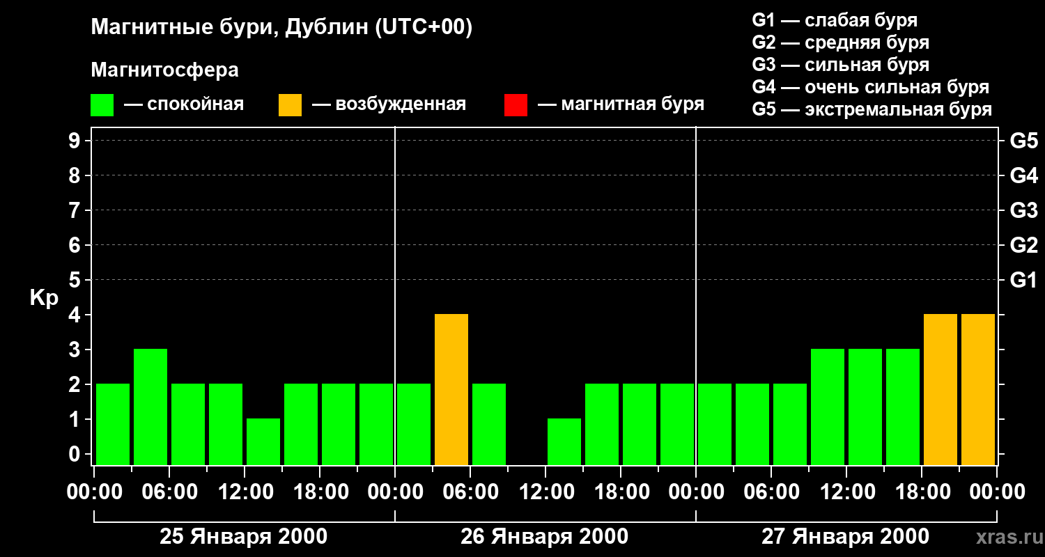 Изменения геомагнитного индекса Kp с 25 по 27 января 2000 года для средних широт