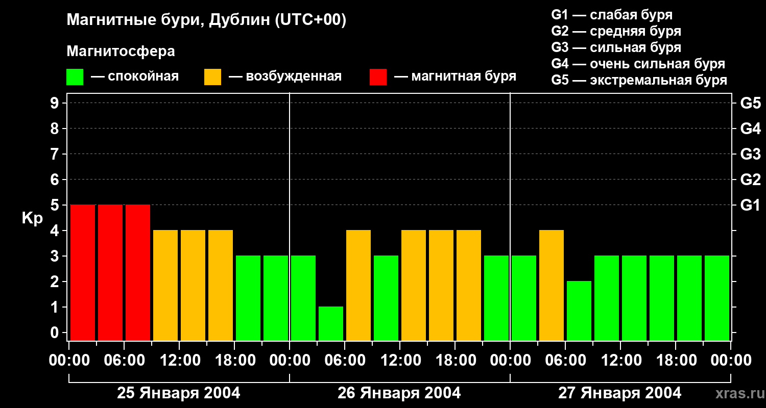 Изменения геомагнитного индекса Kp с 25 по 27 января 2004 года для средних широт